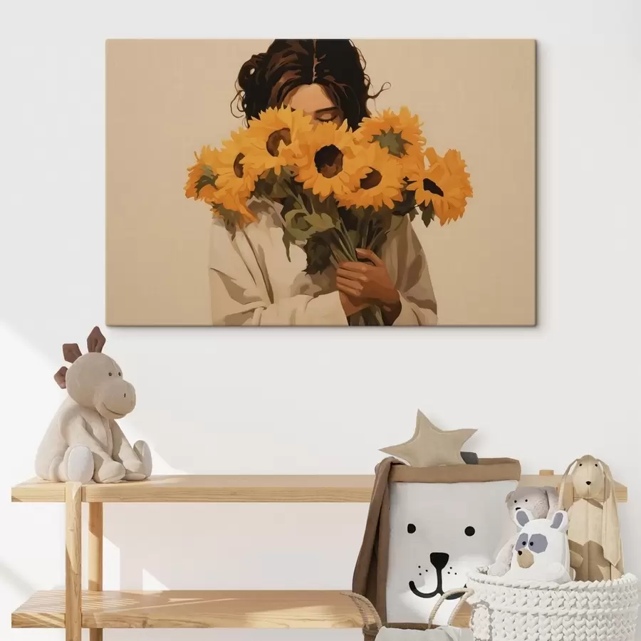 Mergaitė su bijūnais, akrilo stiliaus piešinys, tamsus fonas
