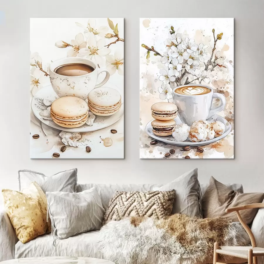 Kavos puodelis su makaronais, jazminų gėlės, akvarelės stilius, kavos pupelės, smėlio spalvos