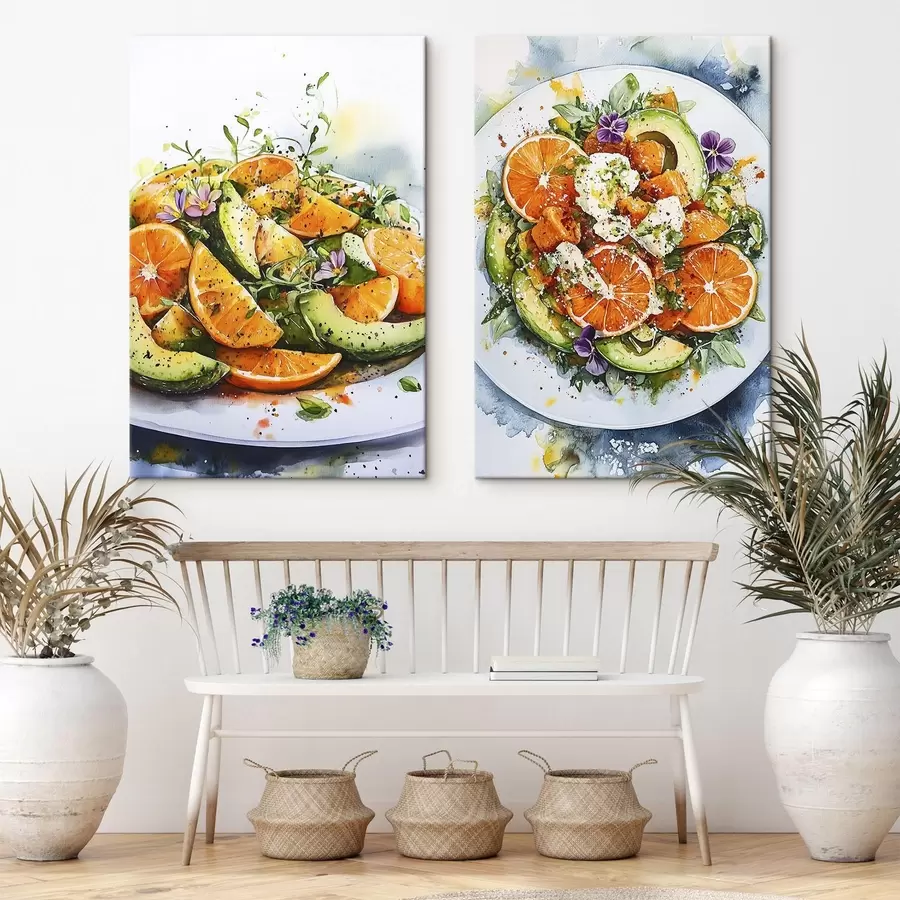 Skanios šventinės salotos su apelsinais, fetos sūriu, moliūgais ir avokadais, akvarelinis maistas