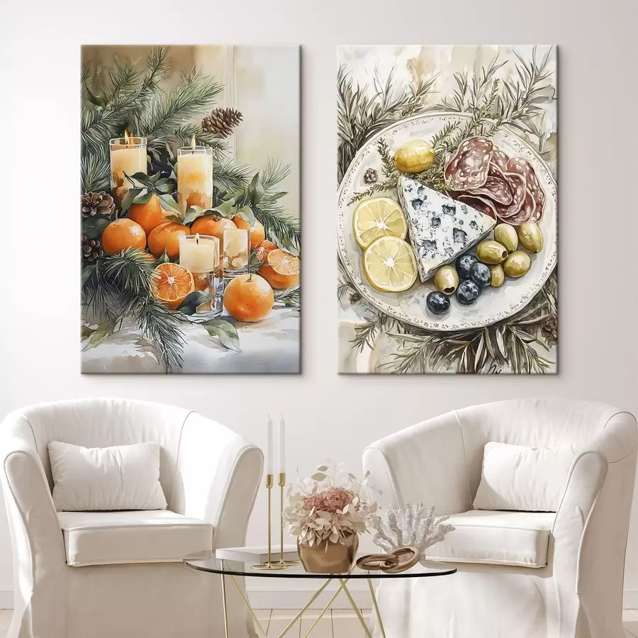Šventinis dekoras su apelsinais, žvakėmis ir pušelėmis, akvarelės stiliaus maistas, mėlynasis sūris, saliamis, alyvuogės