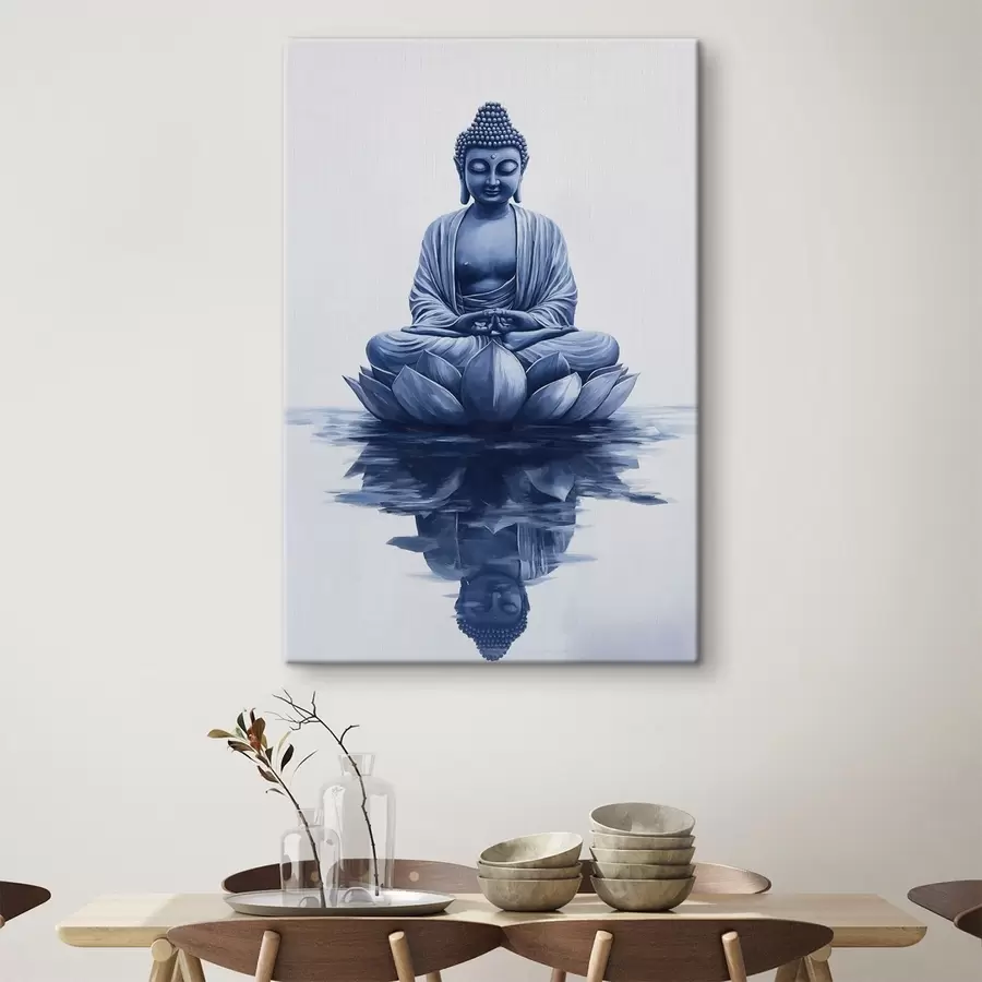 Medituojantis Buda ežere su lotosais, rytietiškas, akrilo stilius