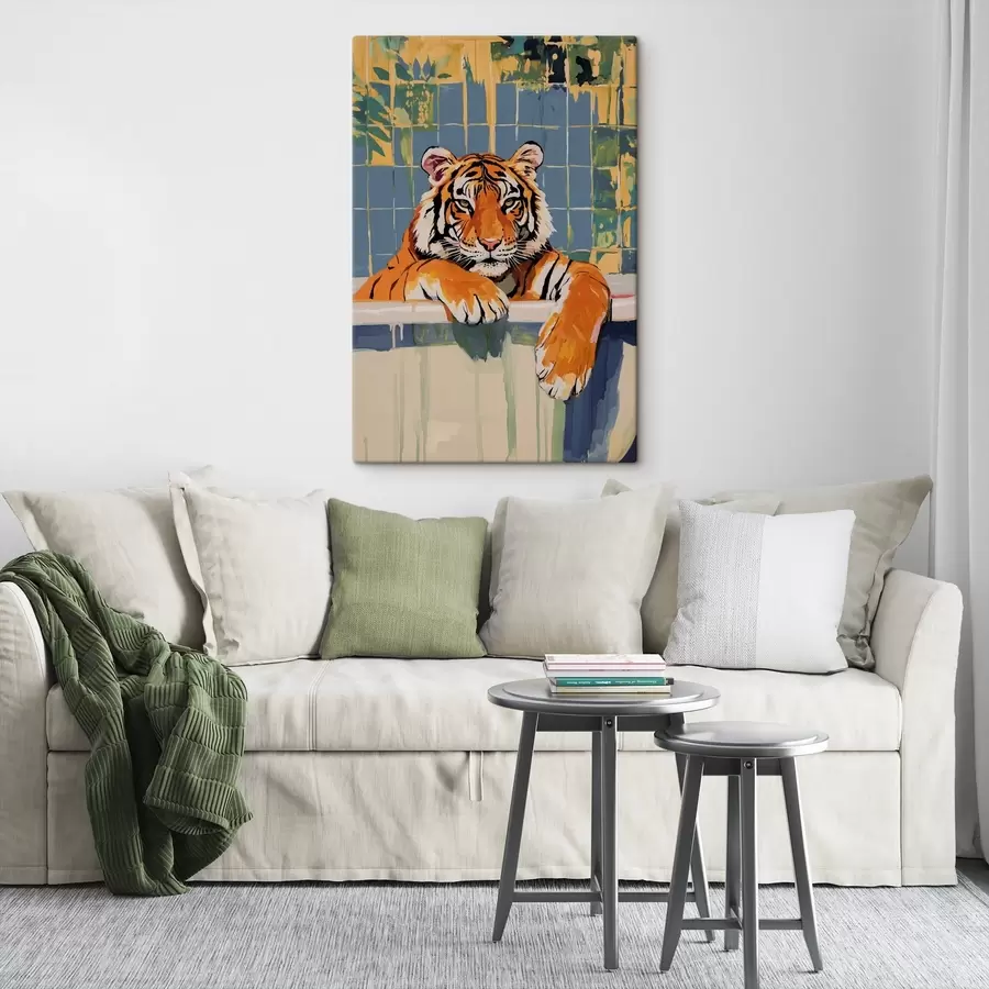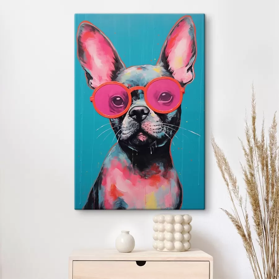 Stilizuotas mopsiuko vandenyje portretas su išraiškingu žvilgsniu