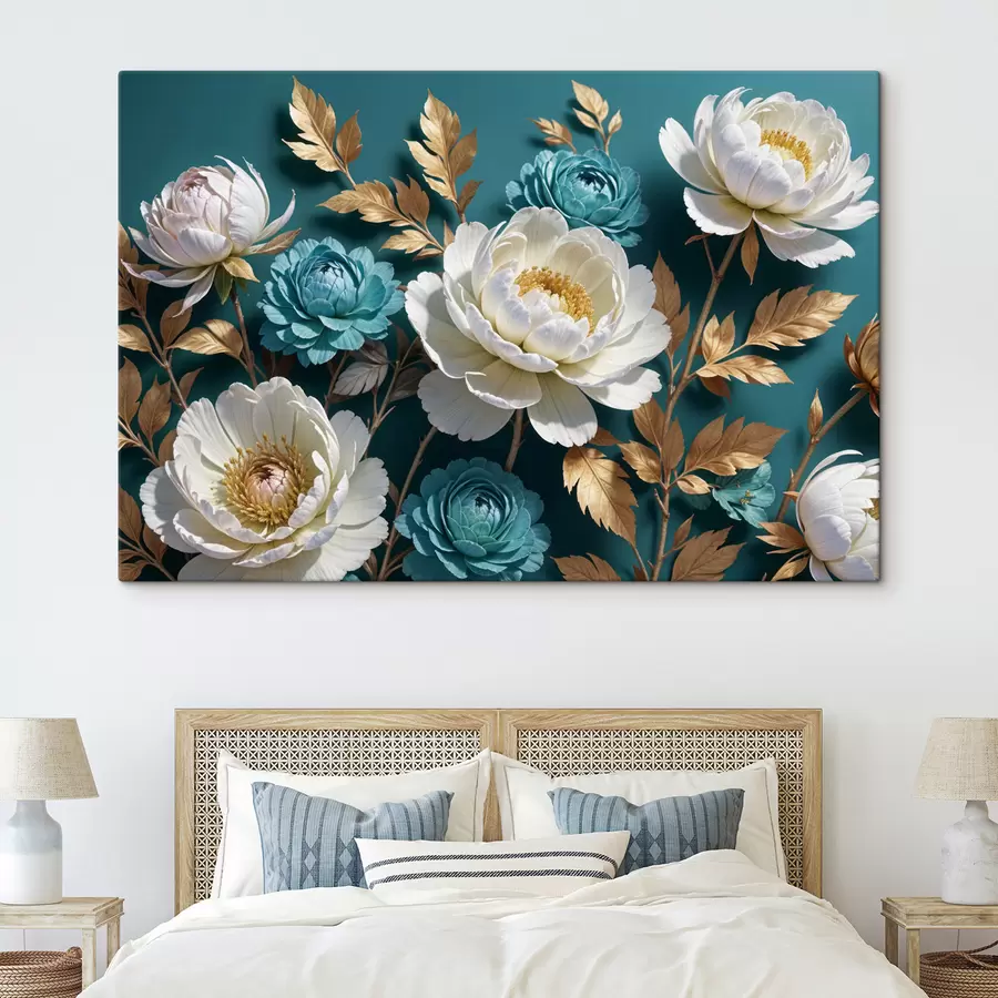 Didelių baltų ir melsvai žalių bijūnų gėlių puokštė geltonais lapais žalsvai melsvos spalvos fone