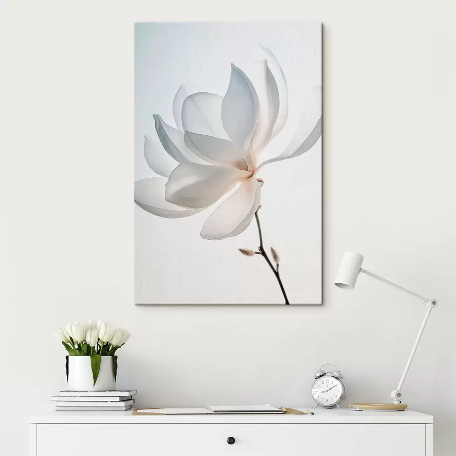 Balta tekstūruota lotoso gėlė su tamsiais lapais, šviesus fonas, minimalistinis dizainas