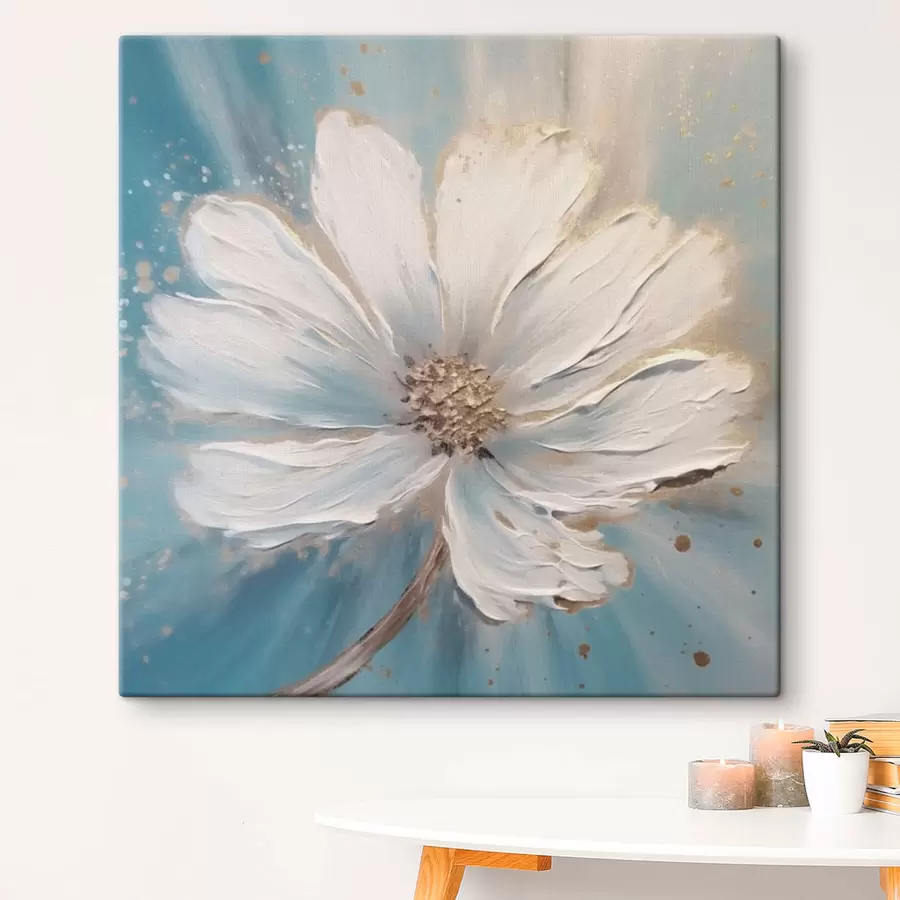 aliejinė tapyba iš švelnių baltų gėlių mėlyname fone
