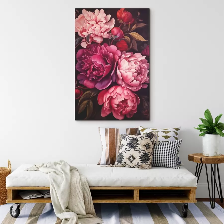 Rausvų bijūnų puokštė su drąsiais brūkšniais tamsiame fone