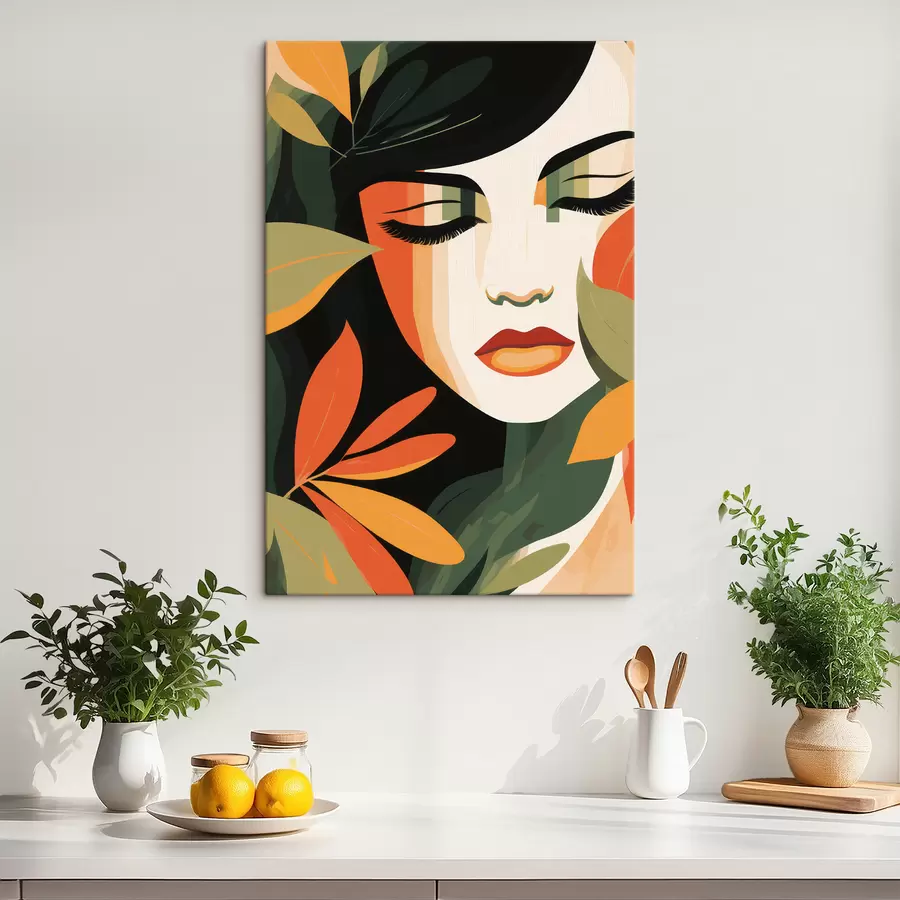 Abstraktus švelnios veido išraiškos moters portretas, nutapytas šiltais tonais, dinamiškais teptuko potėpiais, kurie suteikia gilumo ir emocijų.