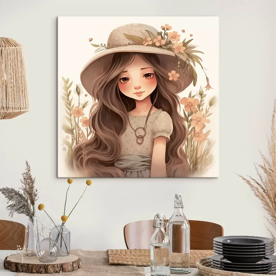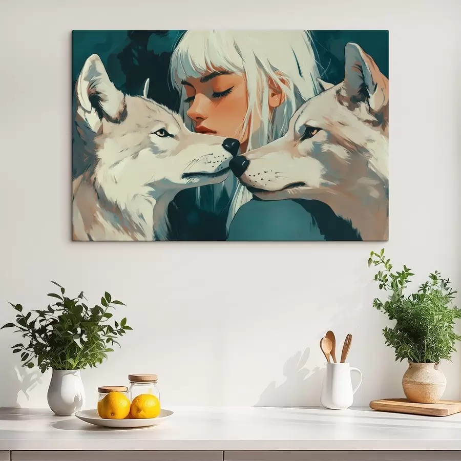 Jaunos merginos su pilkais vilkais piešinys akrilu, anime stilius