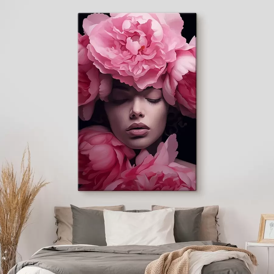 Moteris su lotoso žiedu saulėlydyje, baltas paukštis, piešinys aliejiniais dažais