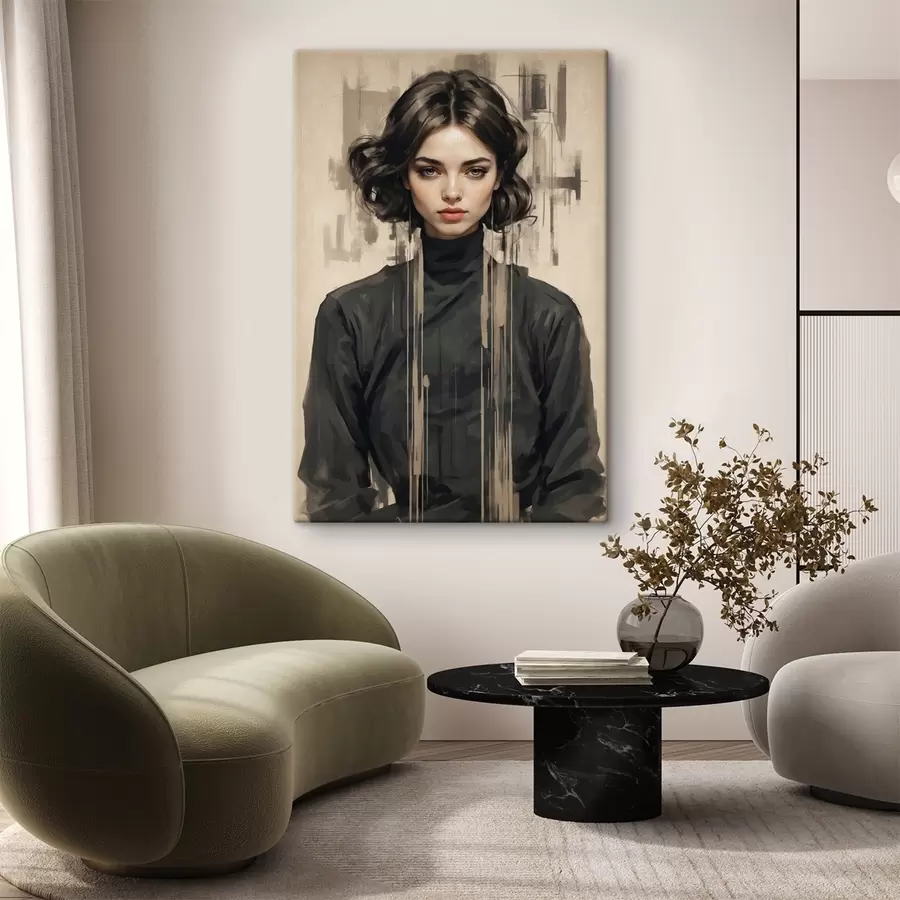Moters trumpais tamsiais plaukais portretas abstrakčiame fone