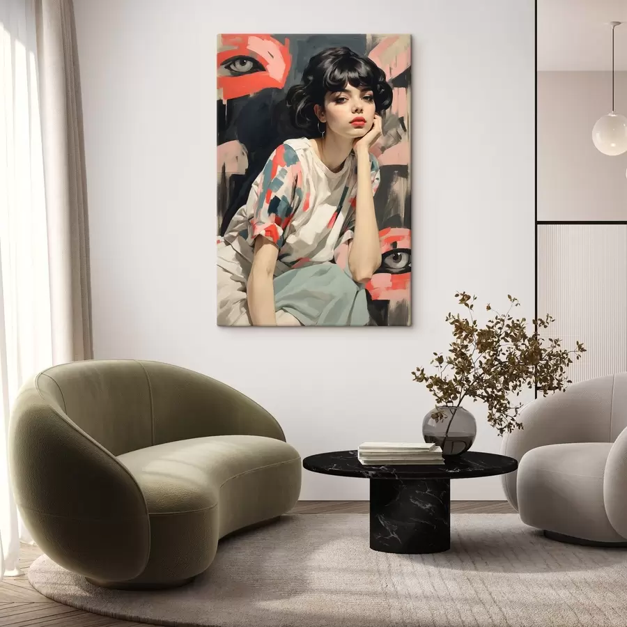 Mergaitės portretas fone su akimis ir abstrakčiais potėpiais