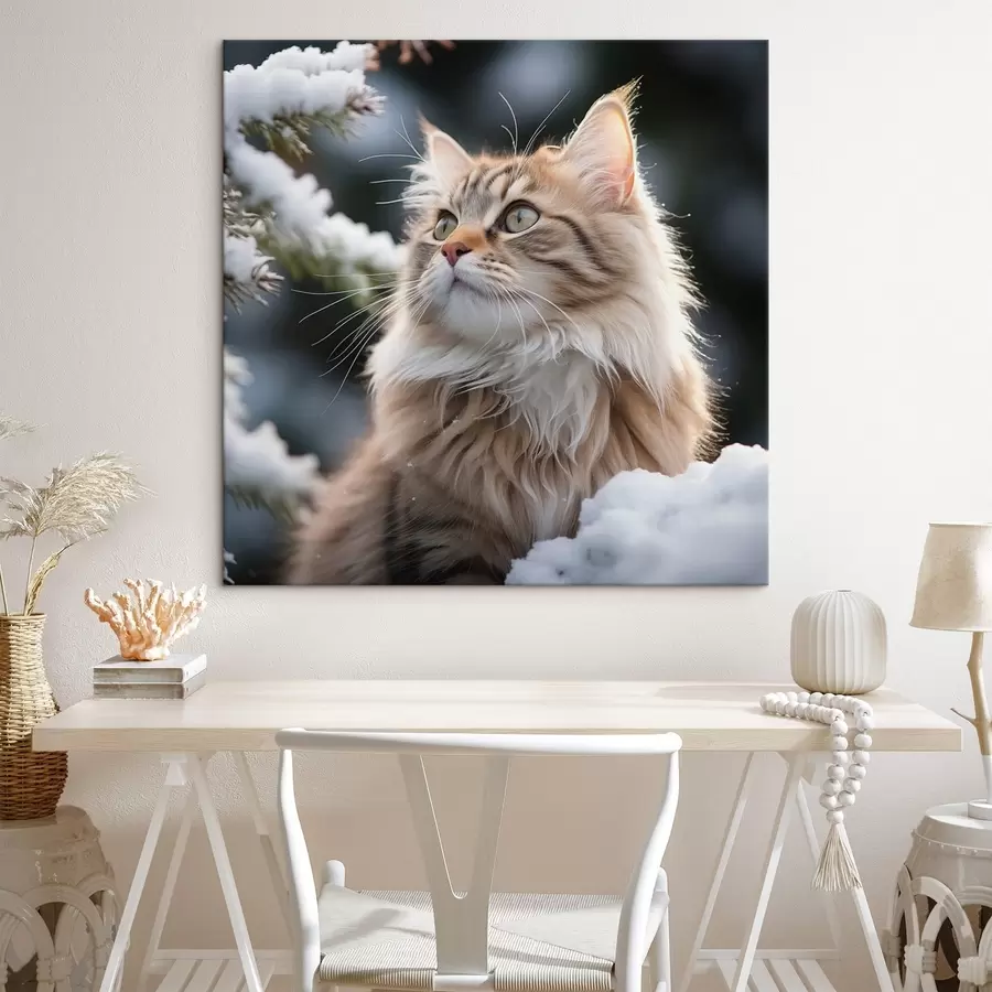 Pūkuota imbierinė katė sėdi šalia sniego tamsiame fone