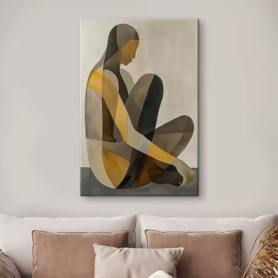 Abstraktus paveikslas, kuriame moteris ilgais tamsiais plaukais vilki baltais marškiniais su spalvingu geometriniu raštu