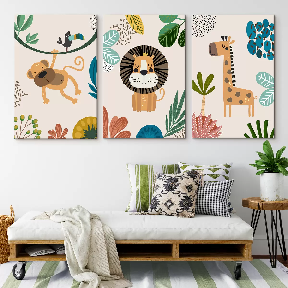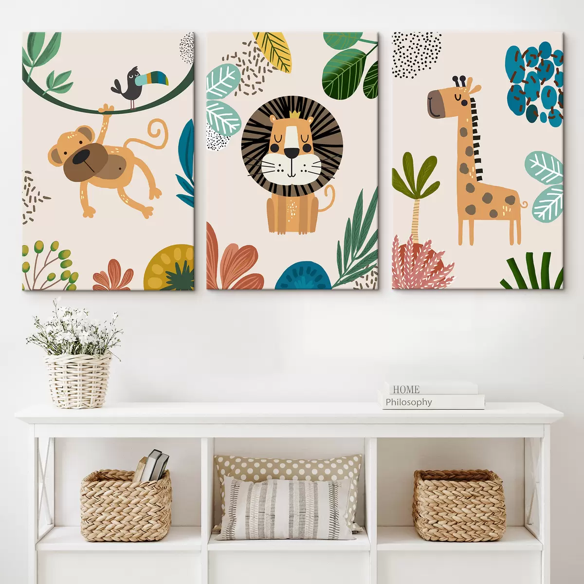 Paveikslas Gyvūnai džiunglėse safari, boho stiliaus: beždžionė, liūtas, žirafa Nr m00332