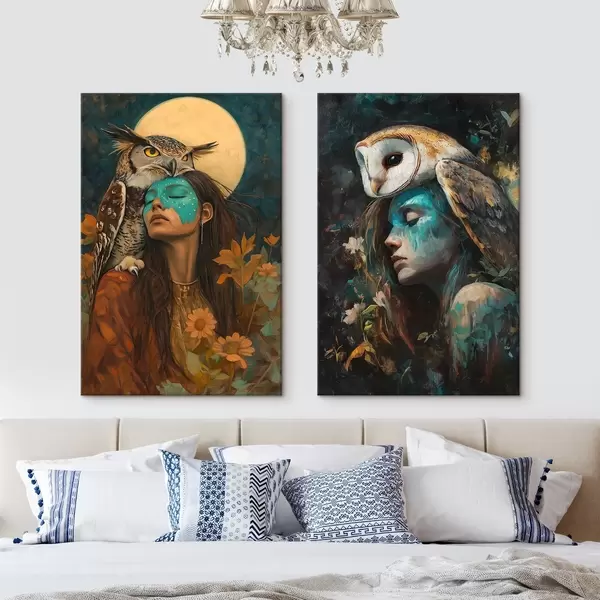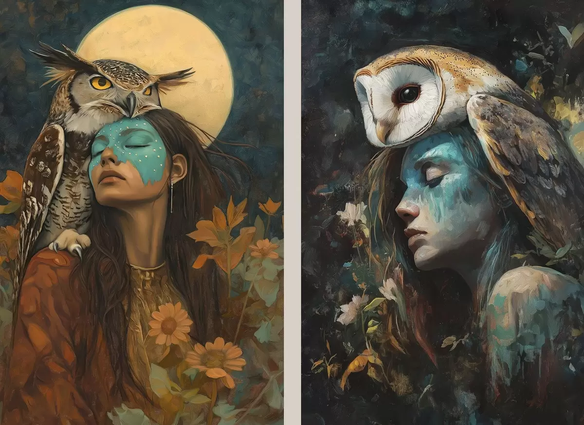 Paveikslas Moteris su pelėda, genčių stilius, mėnulio šviesa, laukinės gėlės, aliejinis piešinys Nr m00377