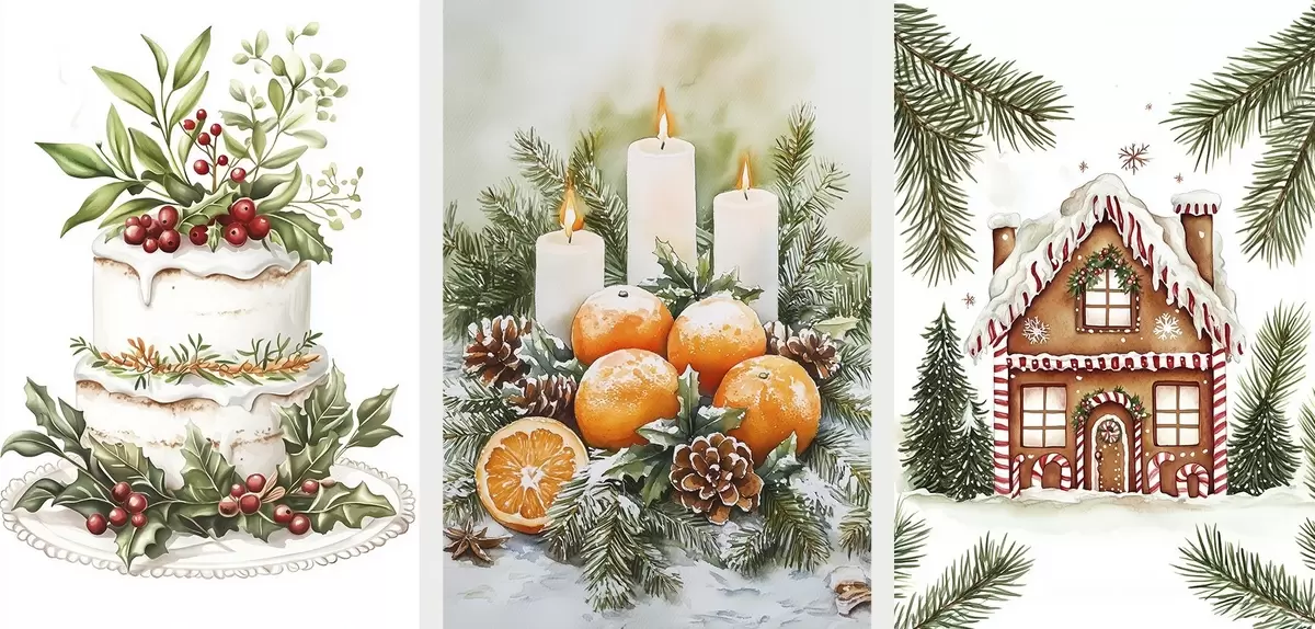 Paveikslas Kalėdų dekoracijos, greitas pyragas, meduolinis namelis, apelsinai ir žvakės, akvarelės stilius Nr m00385