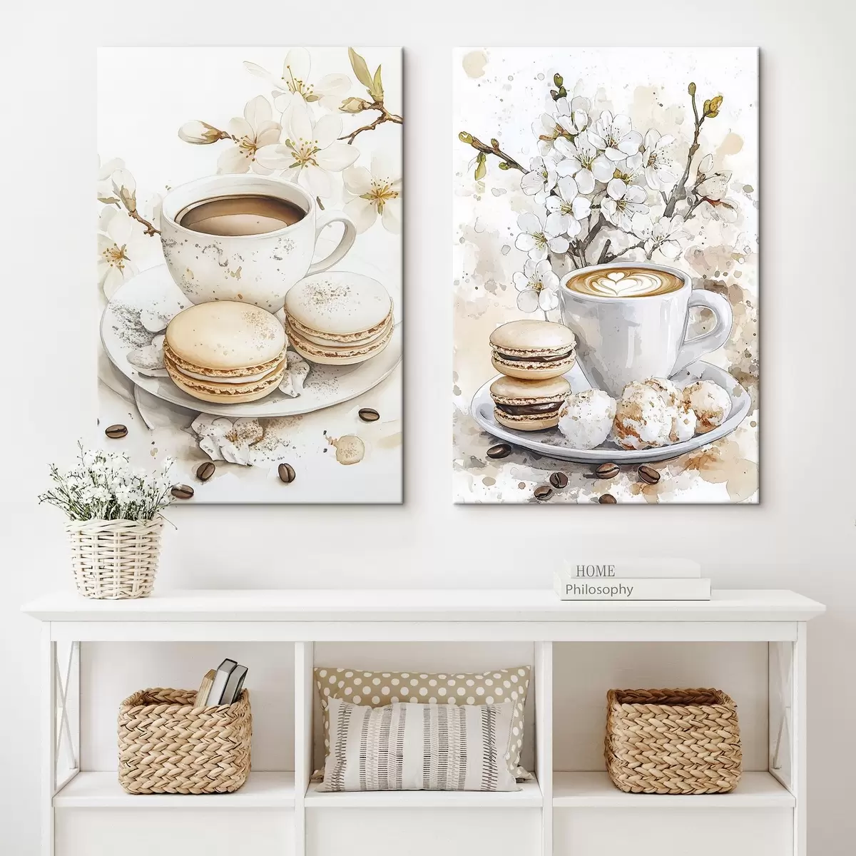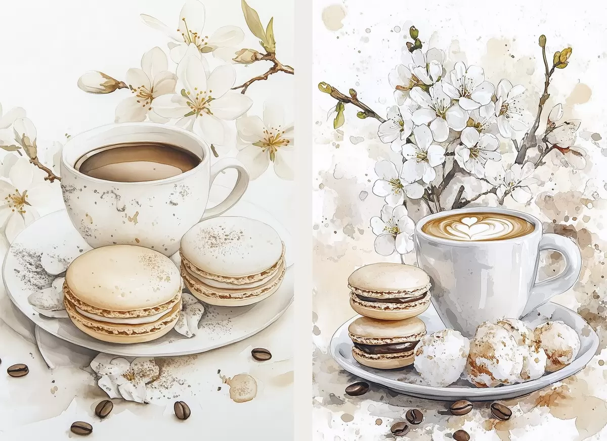 Paveikslas Kavos puodelis su makaronais, jazminų gėlės, akvarelės stilius, kavos pupelės, smėlio spalvos Nr m00387