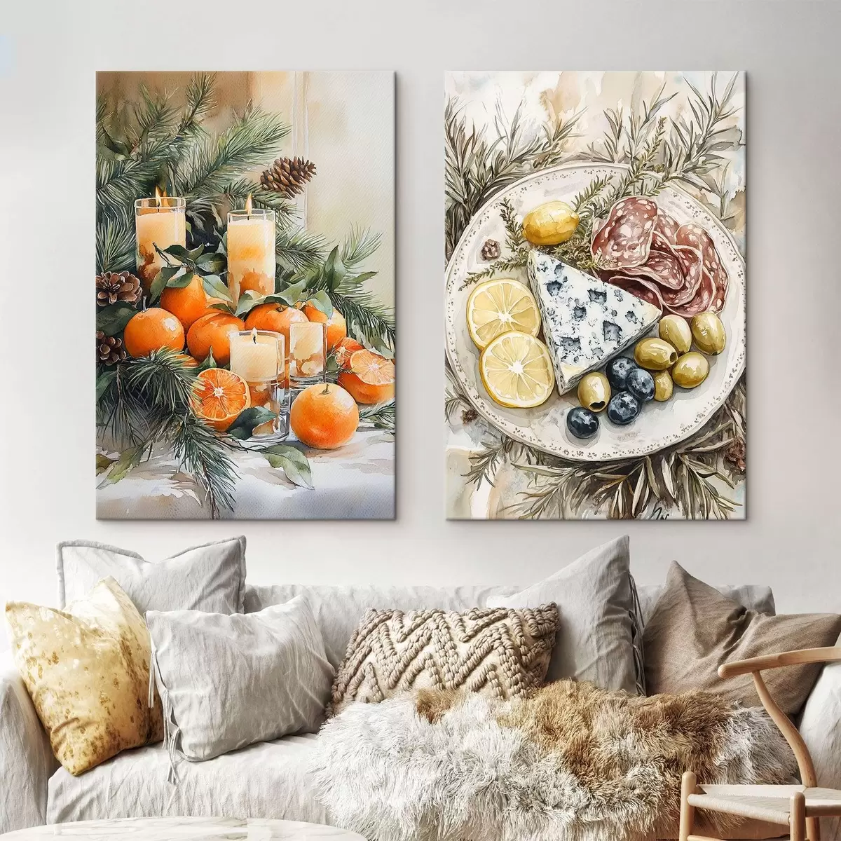 Paveikslas Šventinis dekoras su apelsinais, žvakėmis ir pušelėmis, akvarelės stiliaus maistas, mėlynasis sūris, saliamis, alyvuogės Nr m00389