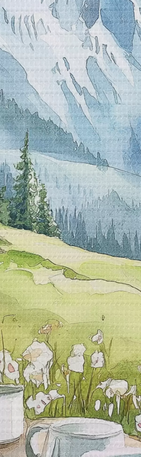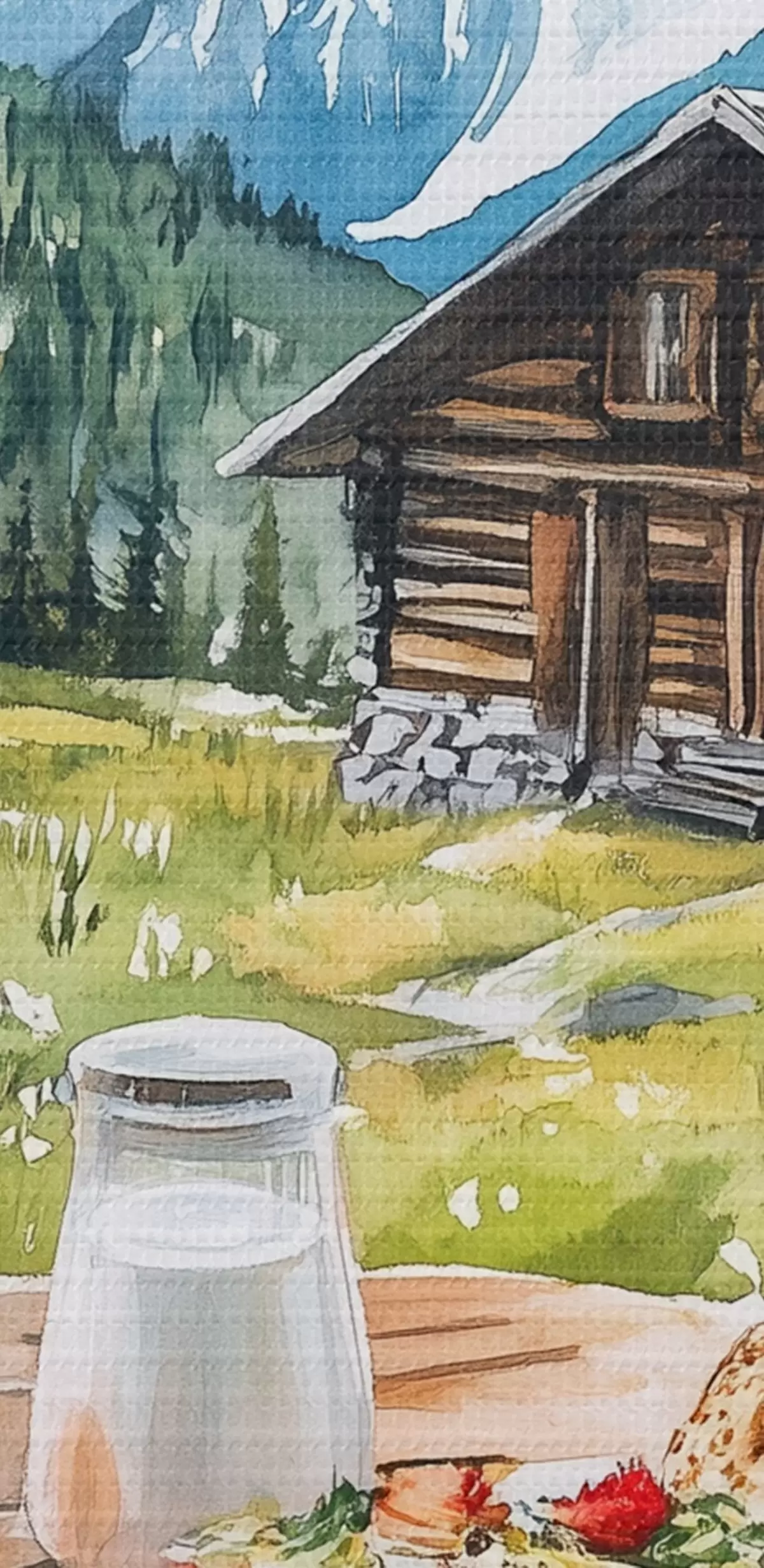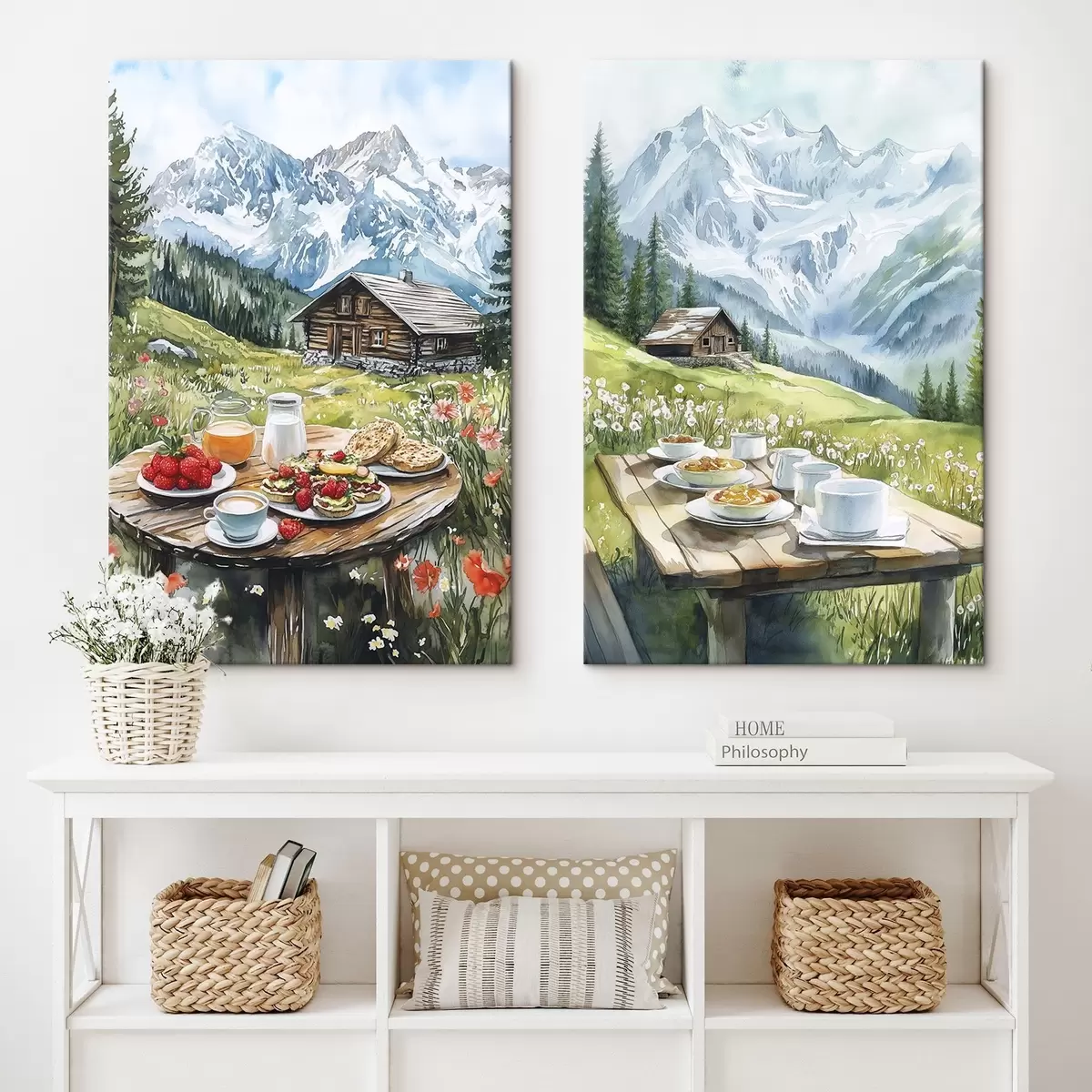 Paveikslas Alpės, gražus kalnų kraštovaizdis, estetiški pusryčiai, mediniai namai Nr m00403