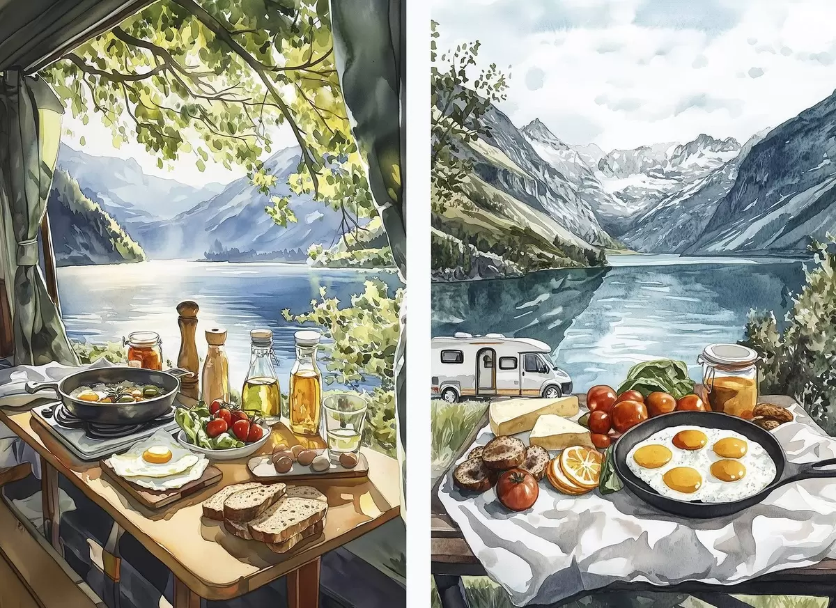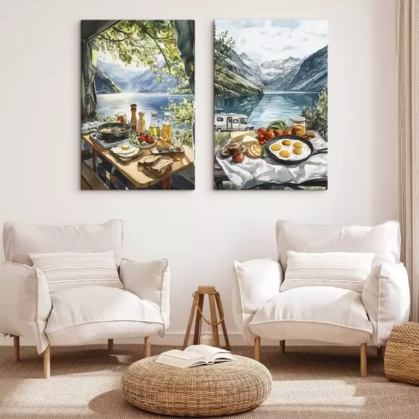 Paveikslas Stovyklavimas, estetiniai pusryčiai prie ežero, akvarelės stilius Nr m00405