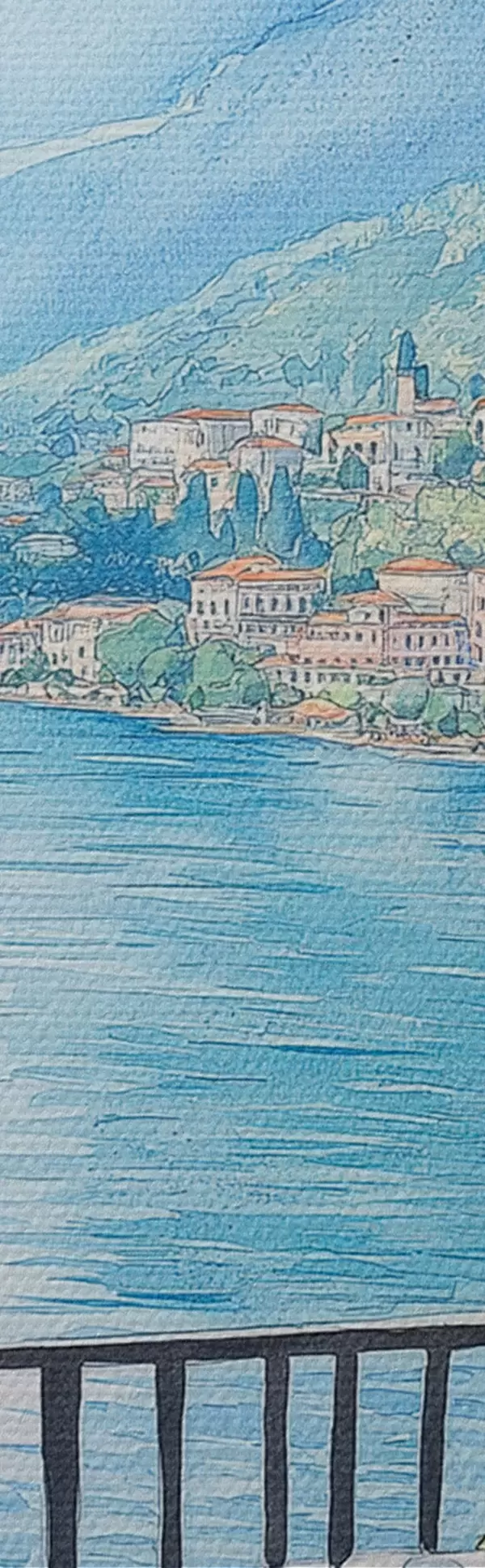 Paveikslas Komo ežeras, vėlyvieji pusryčiai Italijoje, akvarelės stilius, pica margarita, vasaros gamta Nr m00406