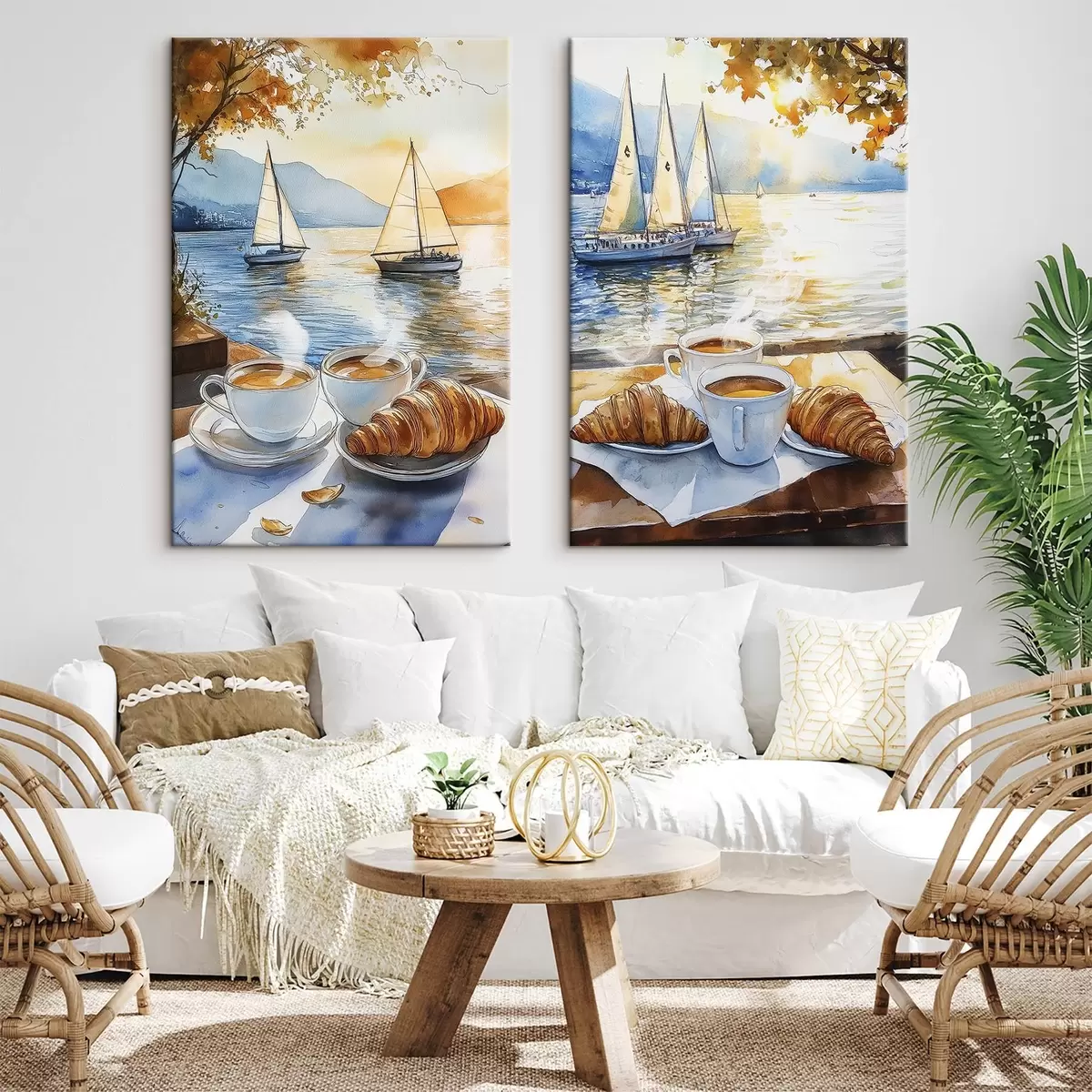 Paveikslas Saulėlydis ant ežero su kavos puodeliu, burlaiviai, gamta, kelionės Nr m00407