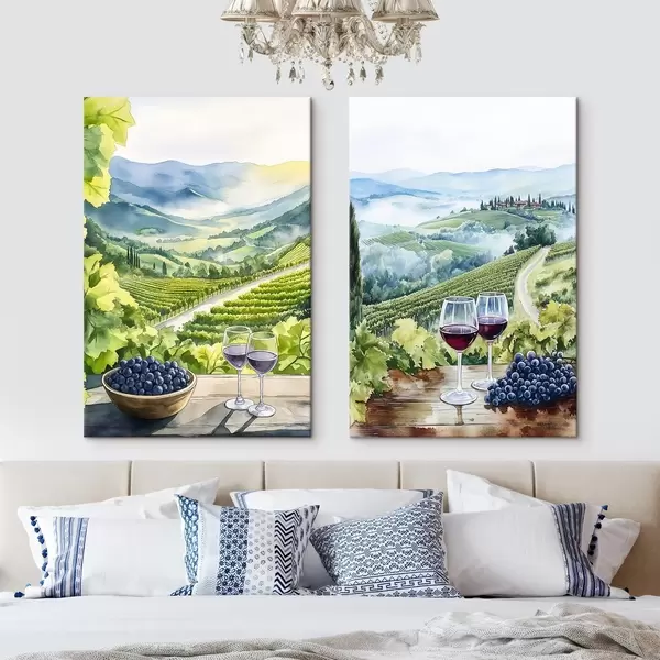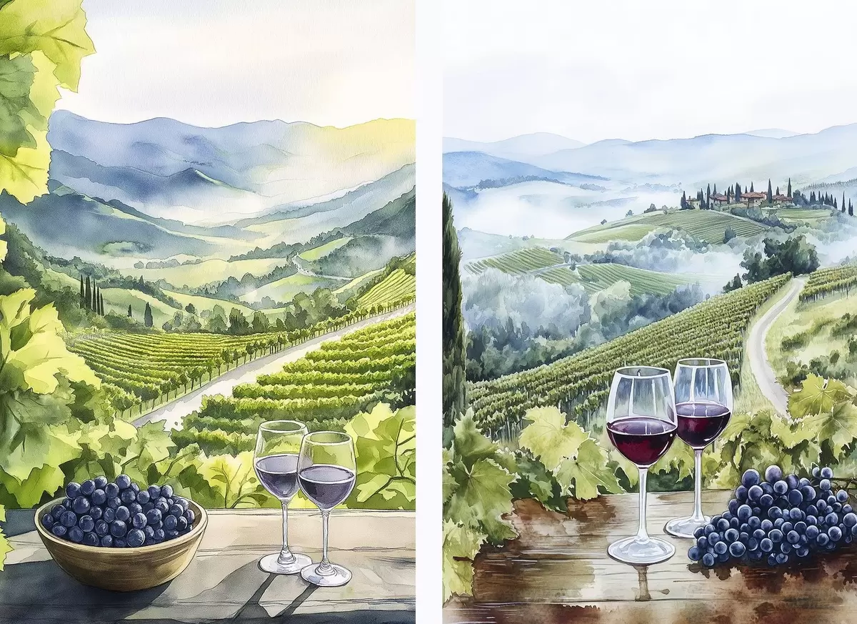 Paveikslas Gražūs Toskanos kraštovaizdžiai, vynuogių kiemai, vyno taurės, akvarelės stilius, Italija Nr m00408