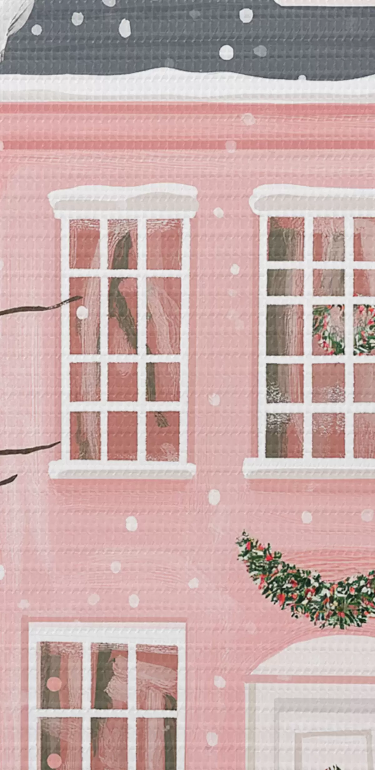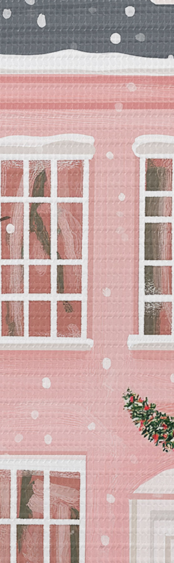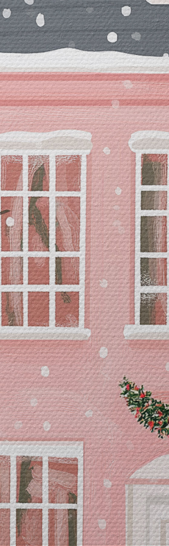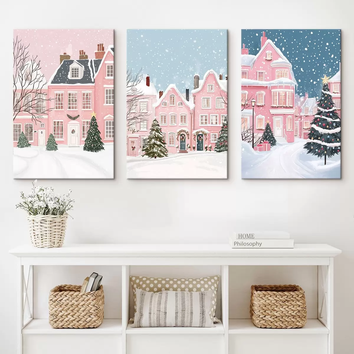 Paveikslas Gražus žiemos miestas su rožiniais namais, pušimis ir snaigėmis Nr m00410