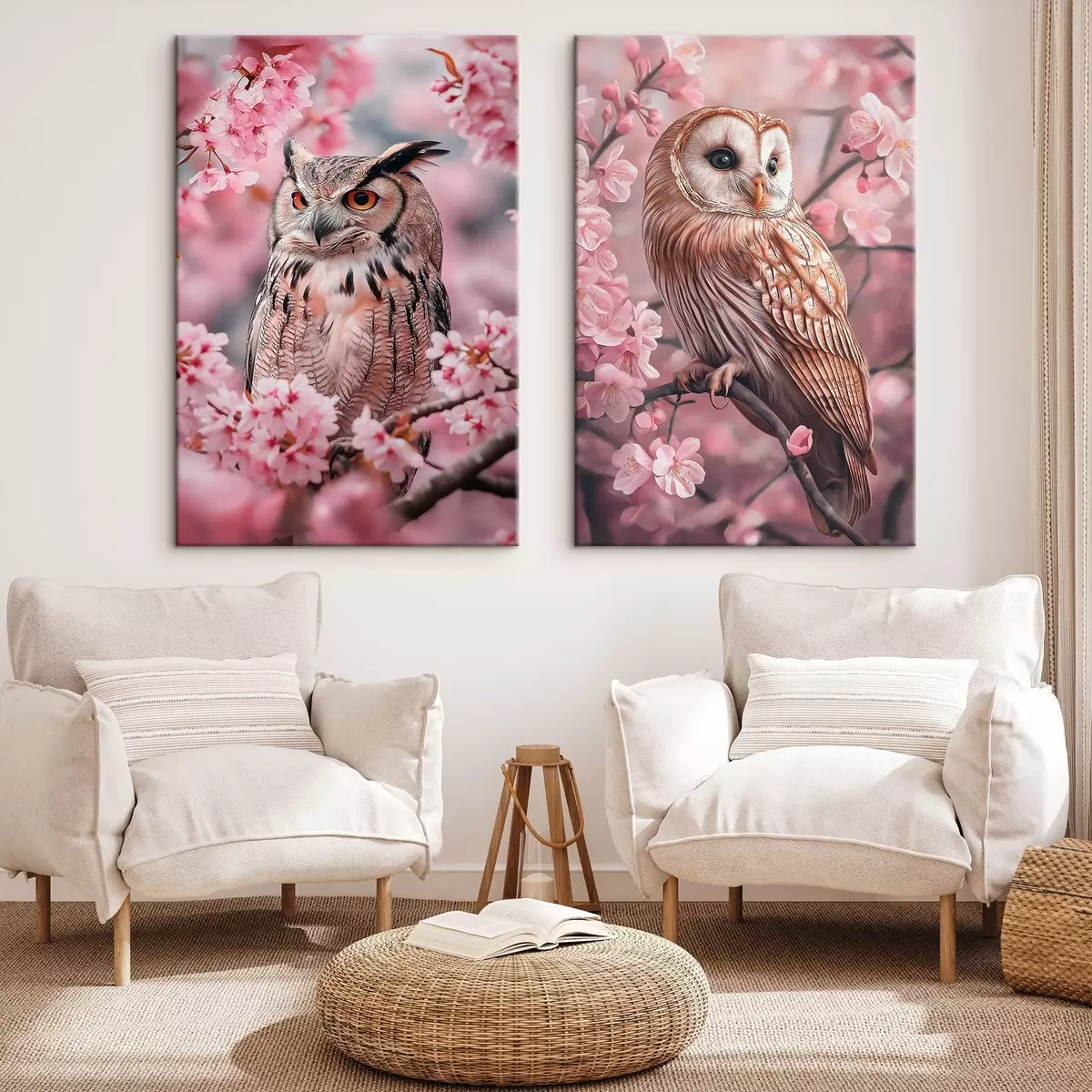 Paveikslas Pelėdos ant vyšnios medžio, rožinės gėlės, realizmas, gamta Nr m00411