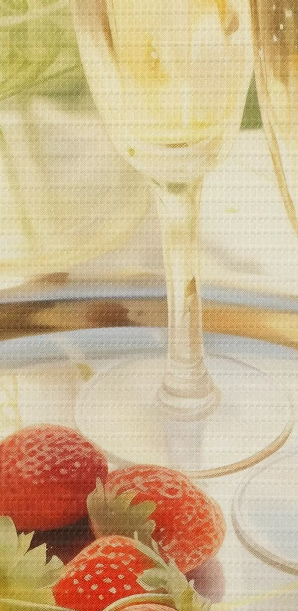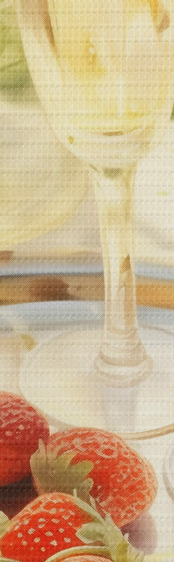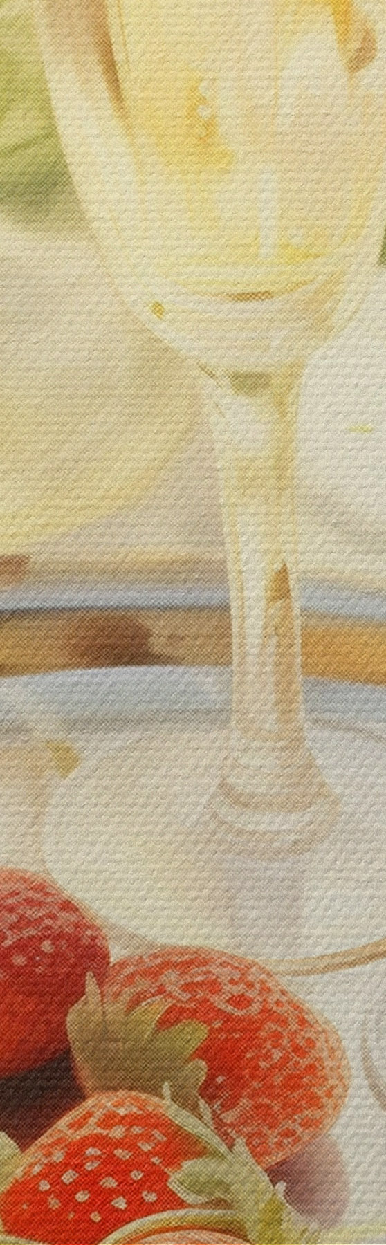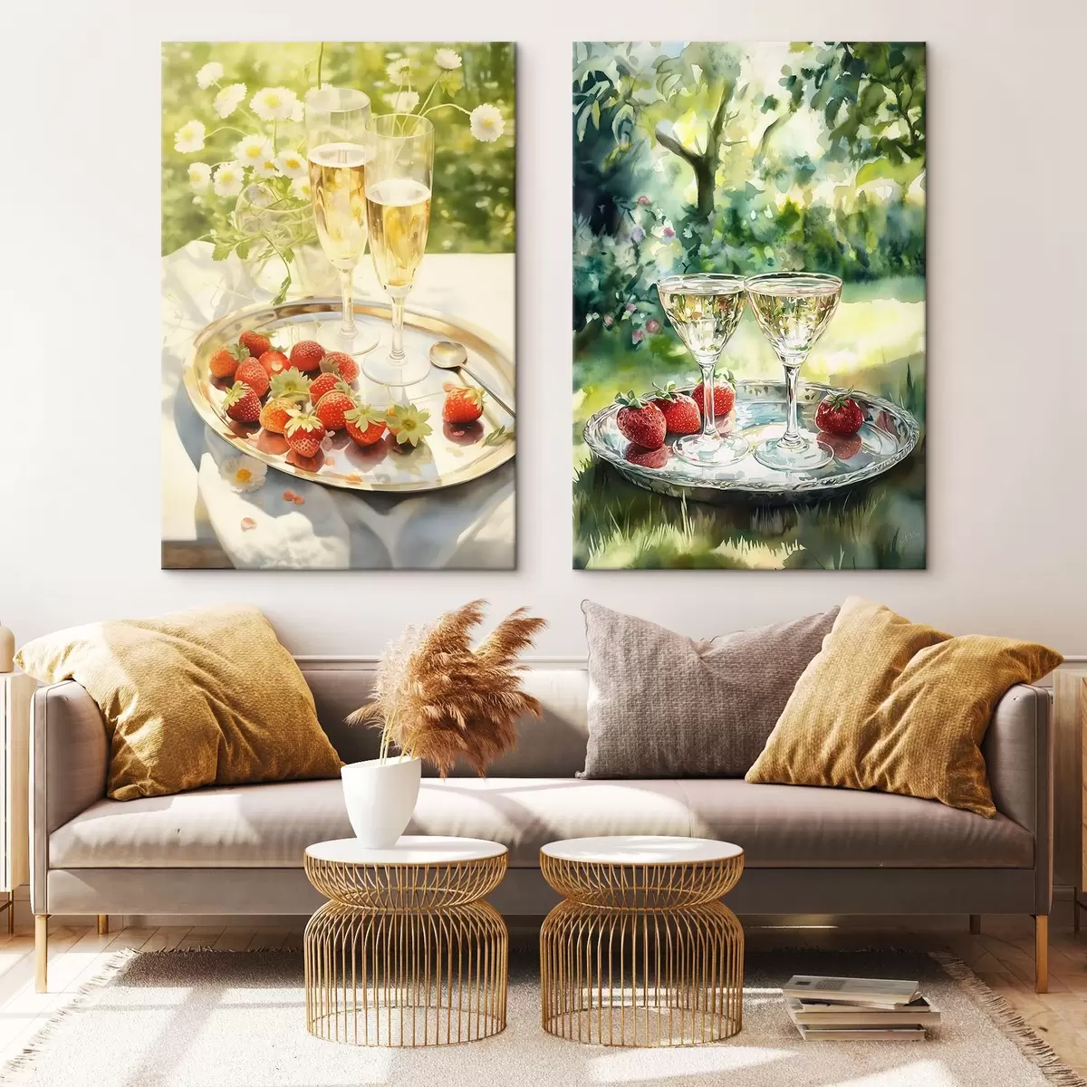 Paveikslas Vasaros piknikas, šampano taurės su braškėmis ant padėklo, ramunėlių žiedai Nr m00414