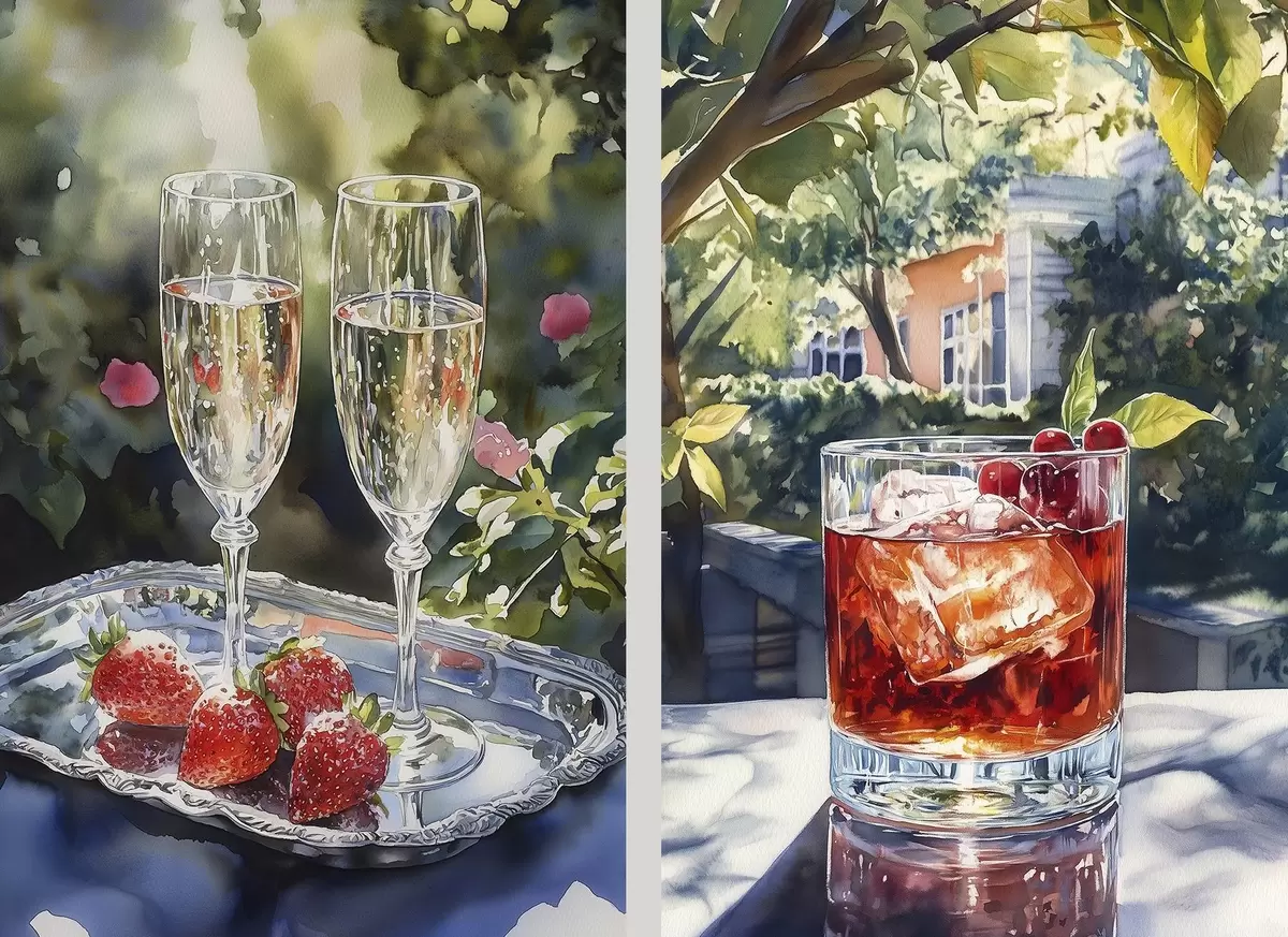Paveikslas Skanūs kokteiliai su uogomis, akvarelės stilius, estetika, vasaros gamta Nr m00415