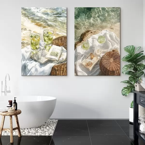Paveikslas Kokteiliai paplūdimyje, akvarelės stiliaus piešinys, vandenynas, vasaros piknikas Nr m00417