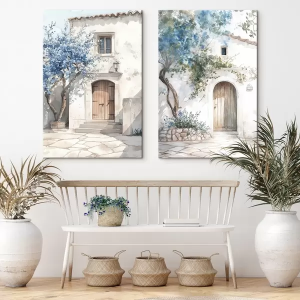 Paveikslas Graikiški balti namai su žydinčiais medžiais, Viduržemio jūros regionas, akvarelės stiliaus piešinys Nr m00419