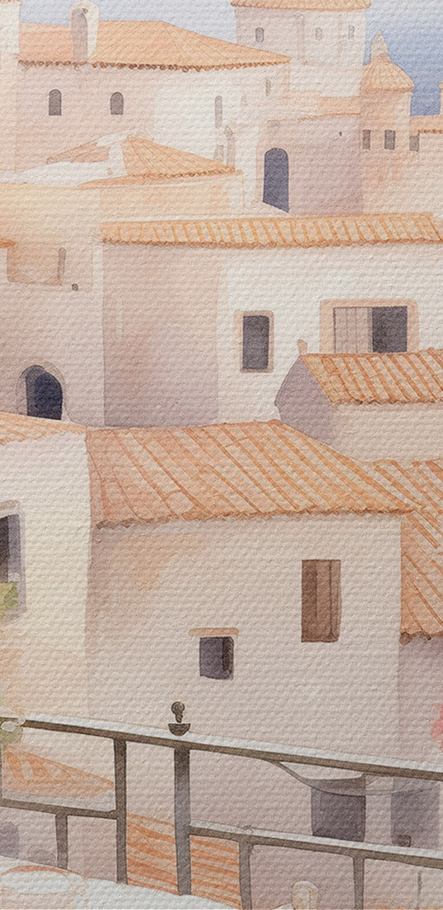 Paveikslas Saulėlydis balkone, architektūra, žydinčios gėlės, akvarelės stilius, Viduržemio jūros regionas Nr m00420
