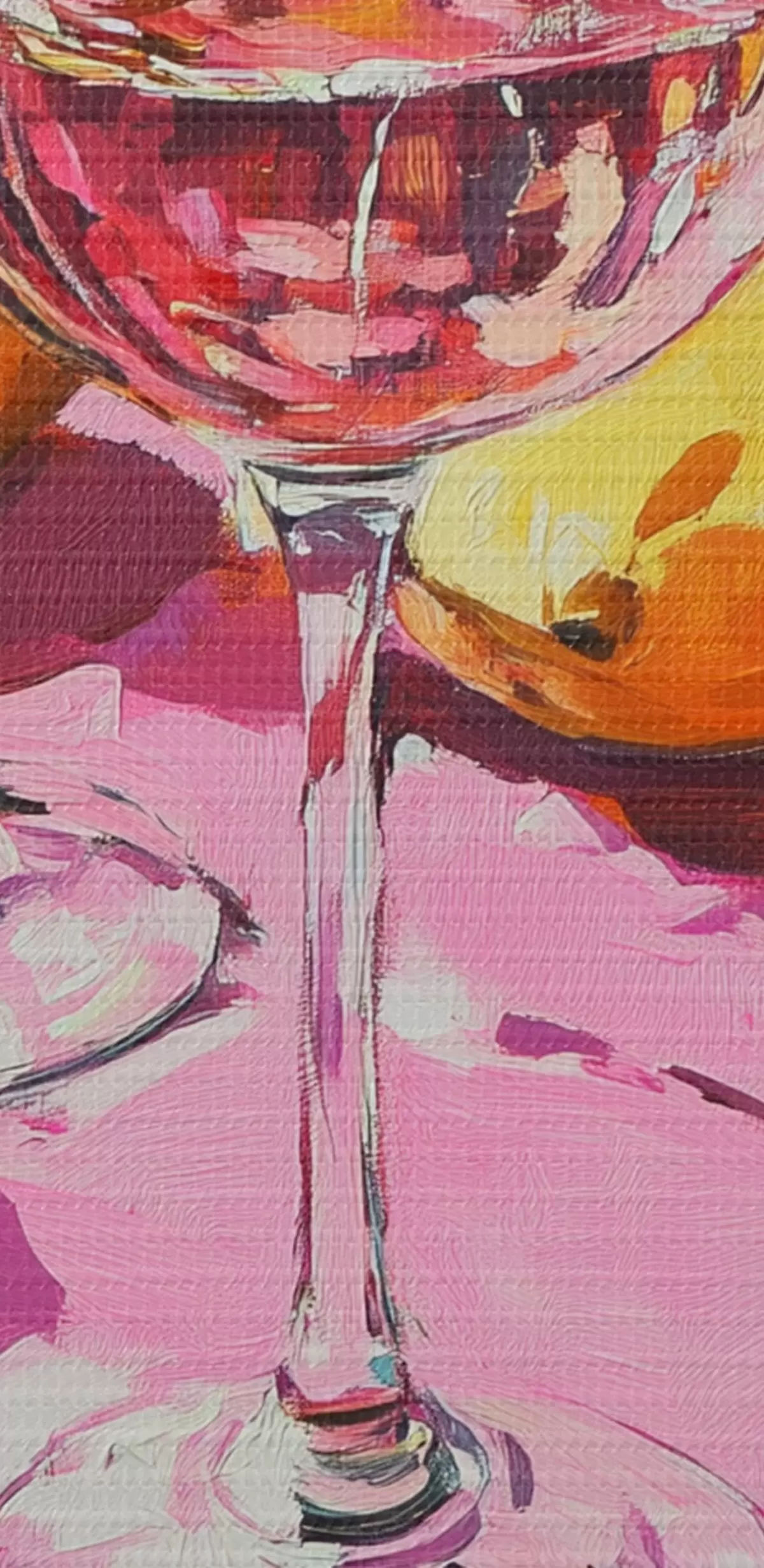 Paveikslas Naftos stiliaus abstrakcija su šampano taurėmis, citrinomis ir akiniais nuo saulės, rožinės spalvos Nr m00444
