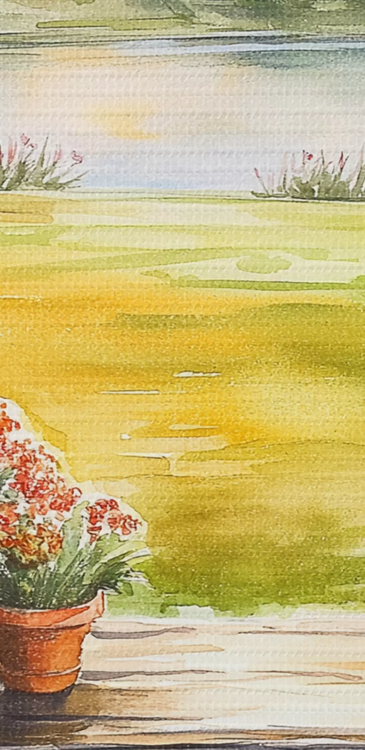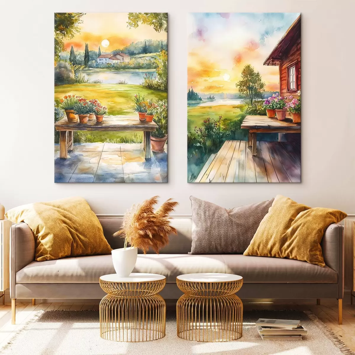Paveikslas Vasaros kaimas, saulėlydis, kaimiškas, gėlės, ežeras, akvarelės stilius Nr m00449