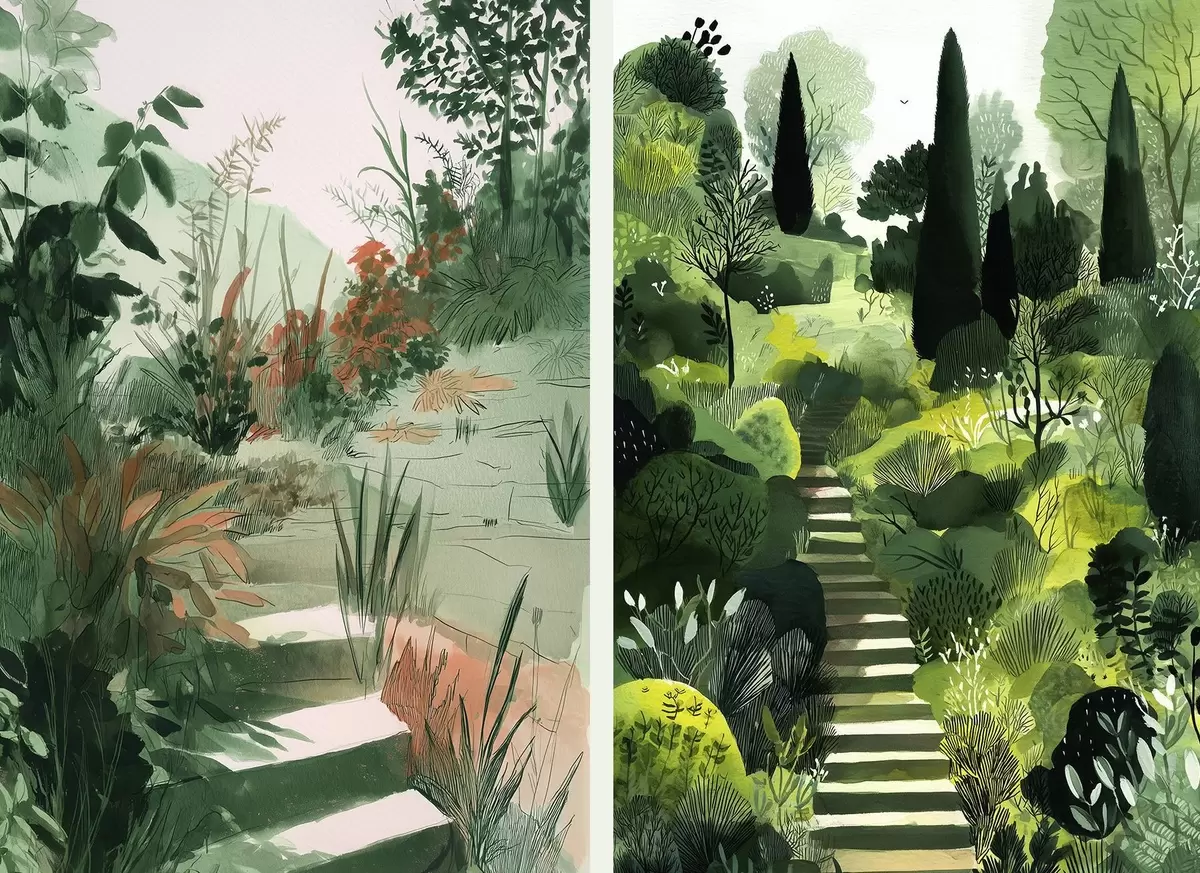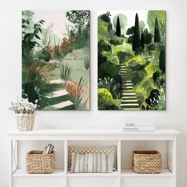Paveikslas Žalias rytietiškas sodas su krūmais ir medžiais Nr m00478