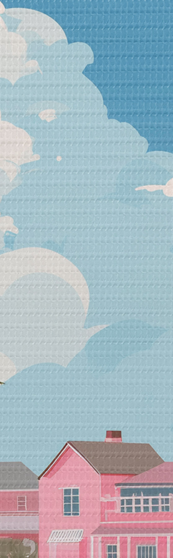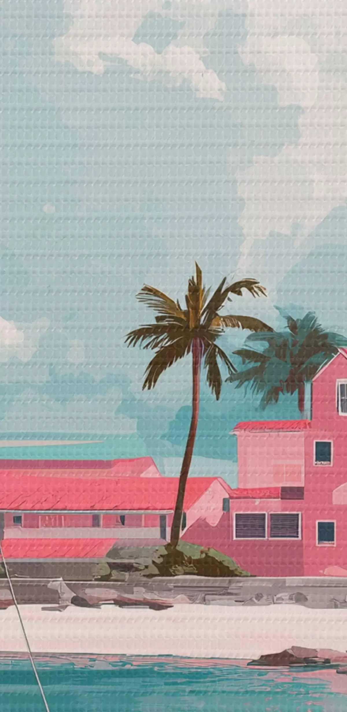 Paveikslas Rožinis vasaros paplūdimys su saule, burlaiviu ir namais Nr m00479