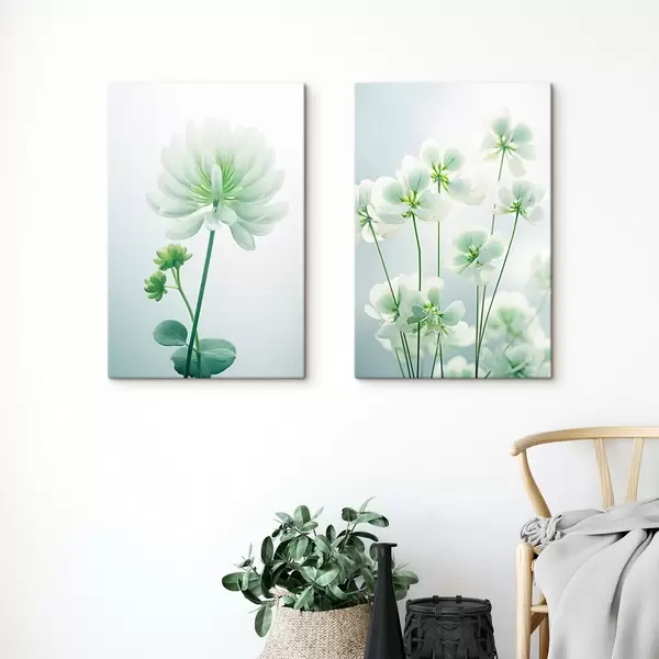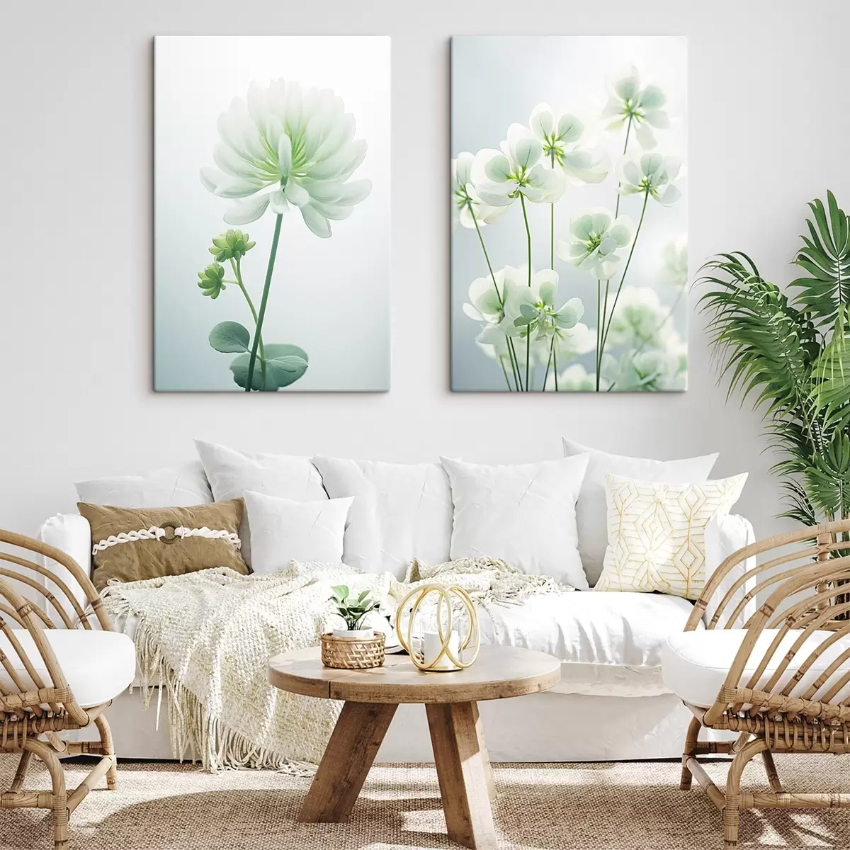 Paveikslas Baltų dobilų gėlės su žaliu stiebu ir lapais, minkštas apšvietimas, švarus fonas, minimalistinė kompozicija, botaninis Nr m00520