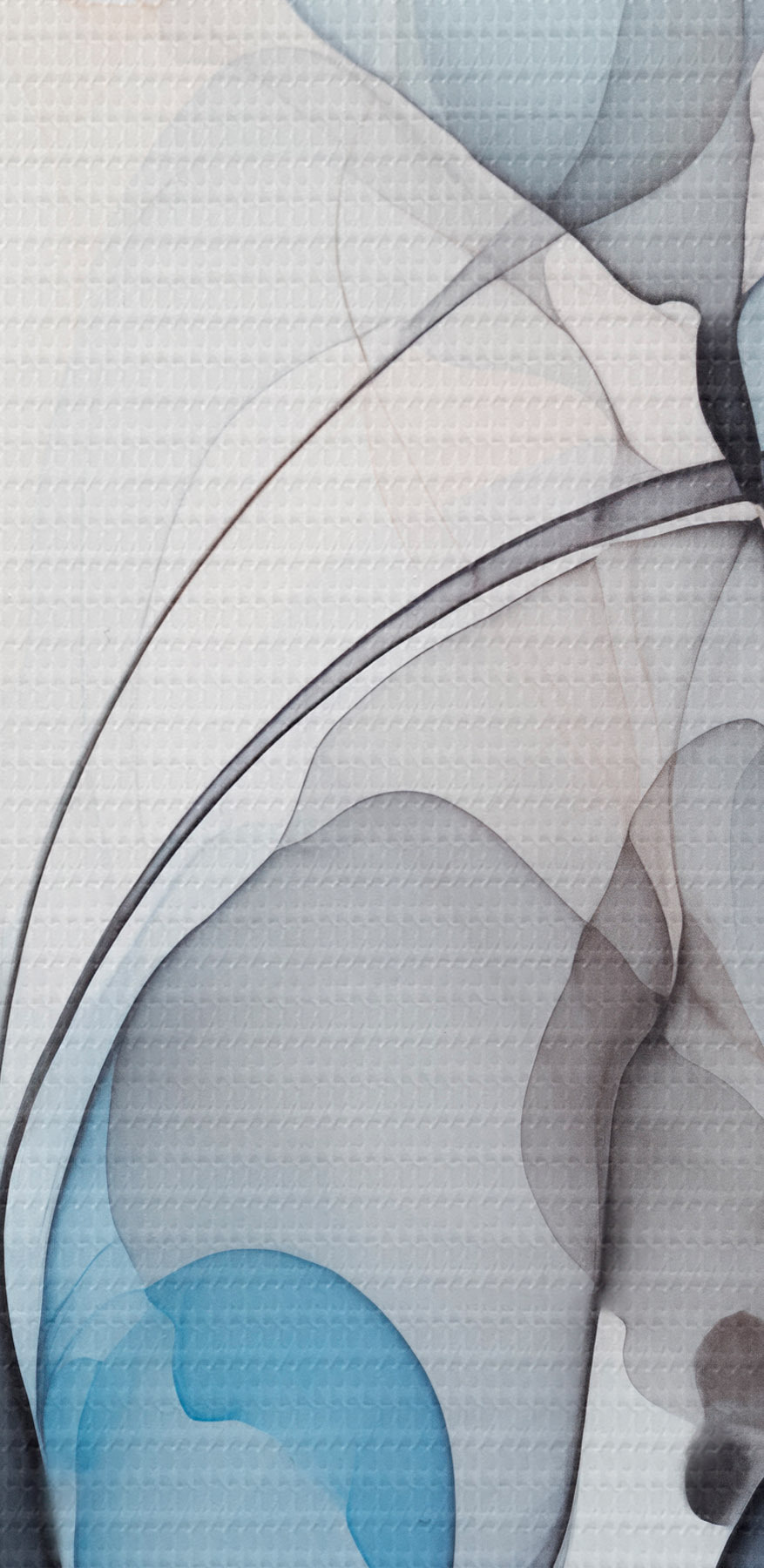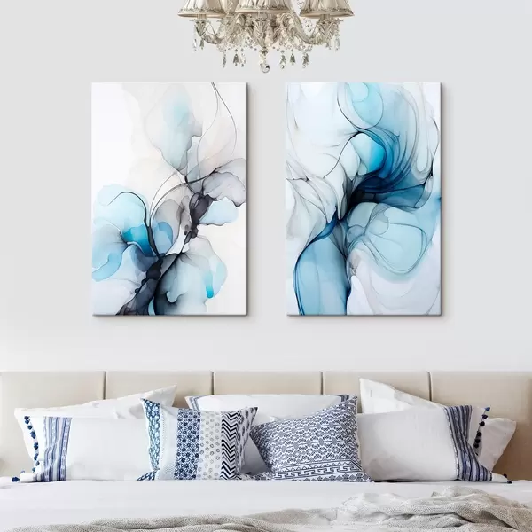 Paveikslas Abstrakti kompozicija su tekančiomis linijomis ir permatomais žiedlapiais mėlynos, baltos ir smėlio spalvos atspalviais, alkoholinio tušo imitacija Nr m00523