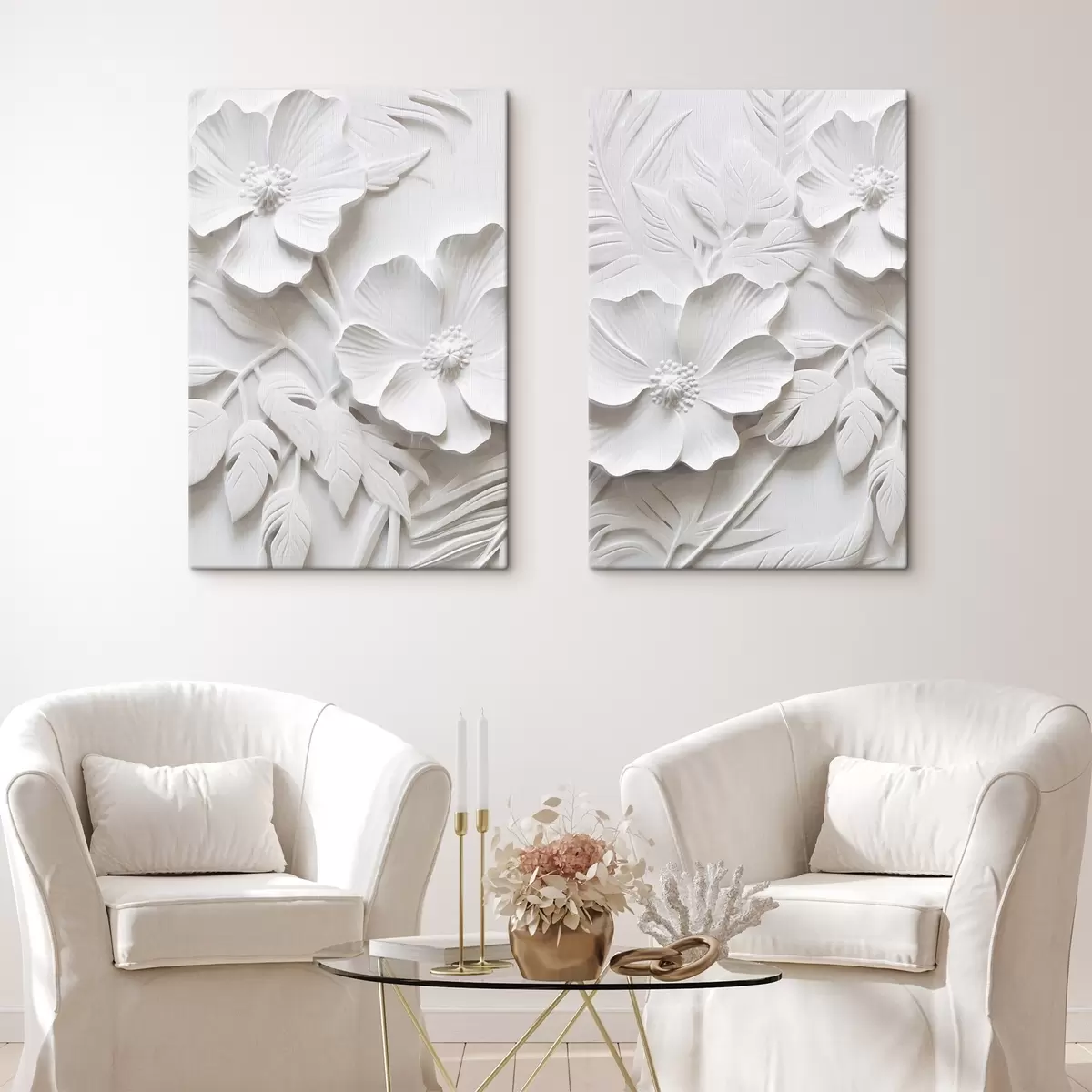 Paveikslas Dekoratyvios minimalistinės baltos gėlės su lapais, reljefo imitacija, baltas fonas Nr m00524