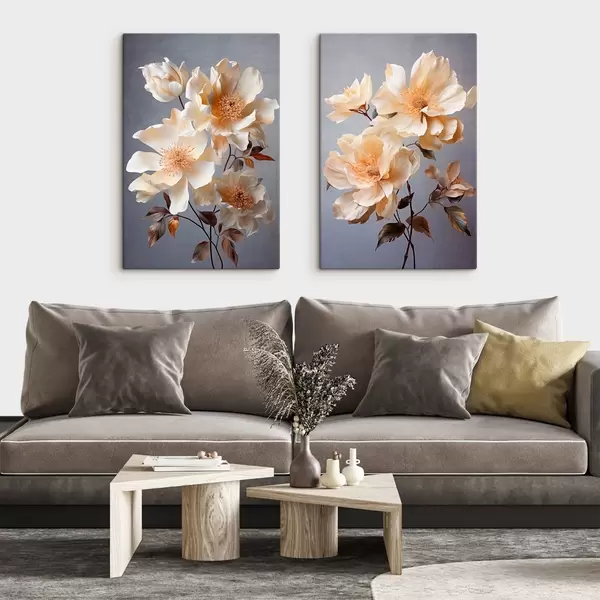 Paveikslas Tekstūruotos gėlės su oranžiniais piesteliais ir oranžiniais lapais pilkame fone, minkšta šviesa, elegantiškas, detalus, realistiškas Nr m00525