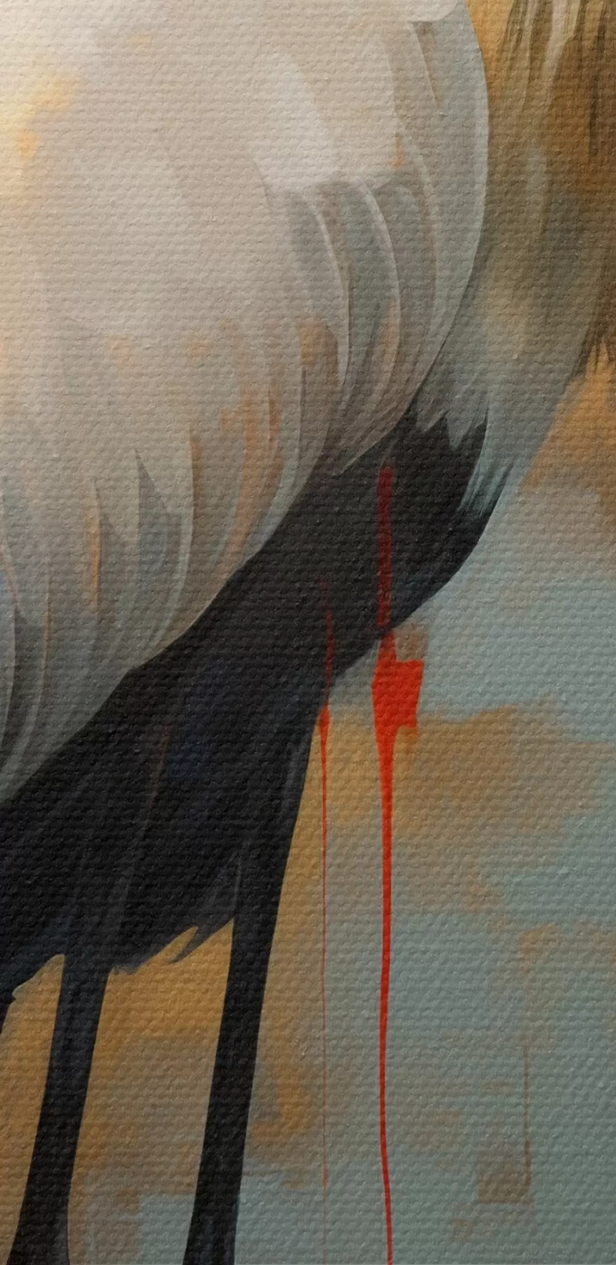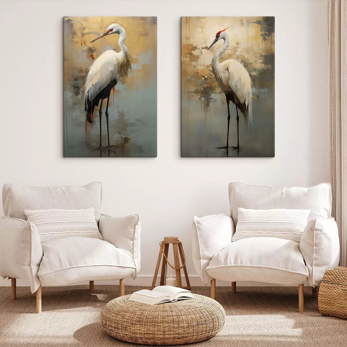 Paveikslas Baltasis garnys prislopintų geltonų, rudų ir mėlynų atspalvių fone, primenančiame miglotą abstraktų peizažą Nr m00530