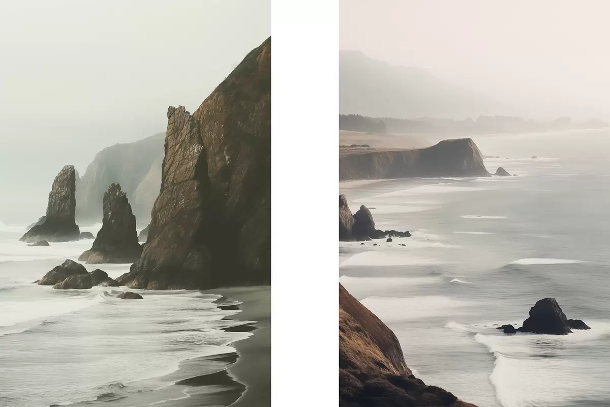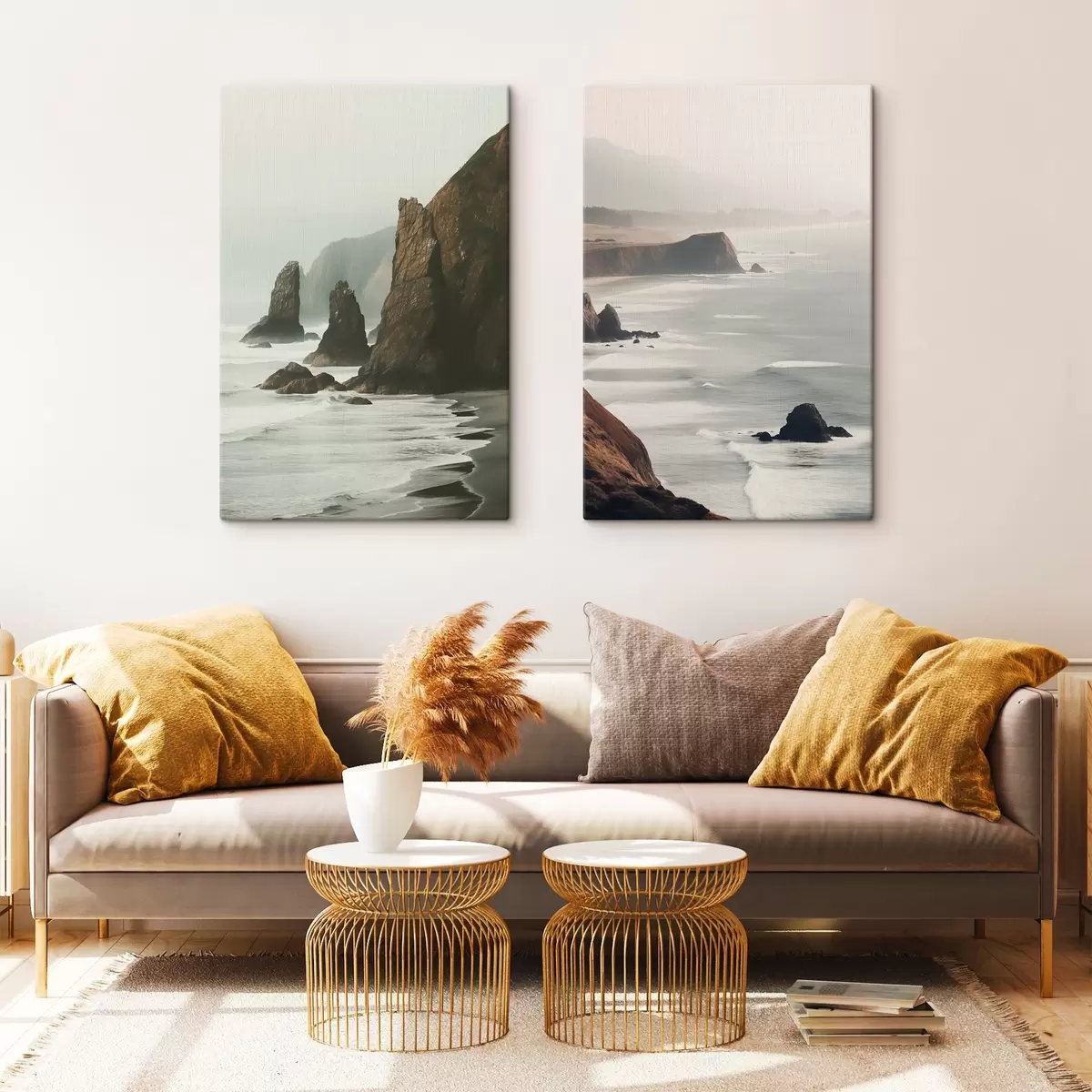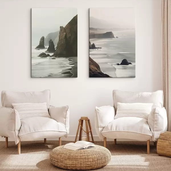Paveikslas Uolėtos uolos ir jūros pakrantė, į krantą atsimušančios bangos, nuotaikingas kraštovaizdis, žemės atspalviai Nr m00531