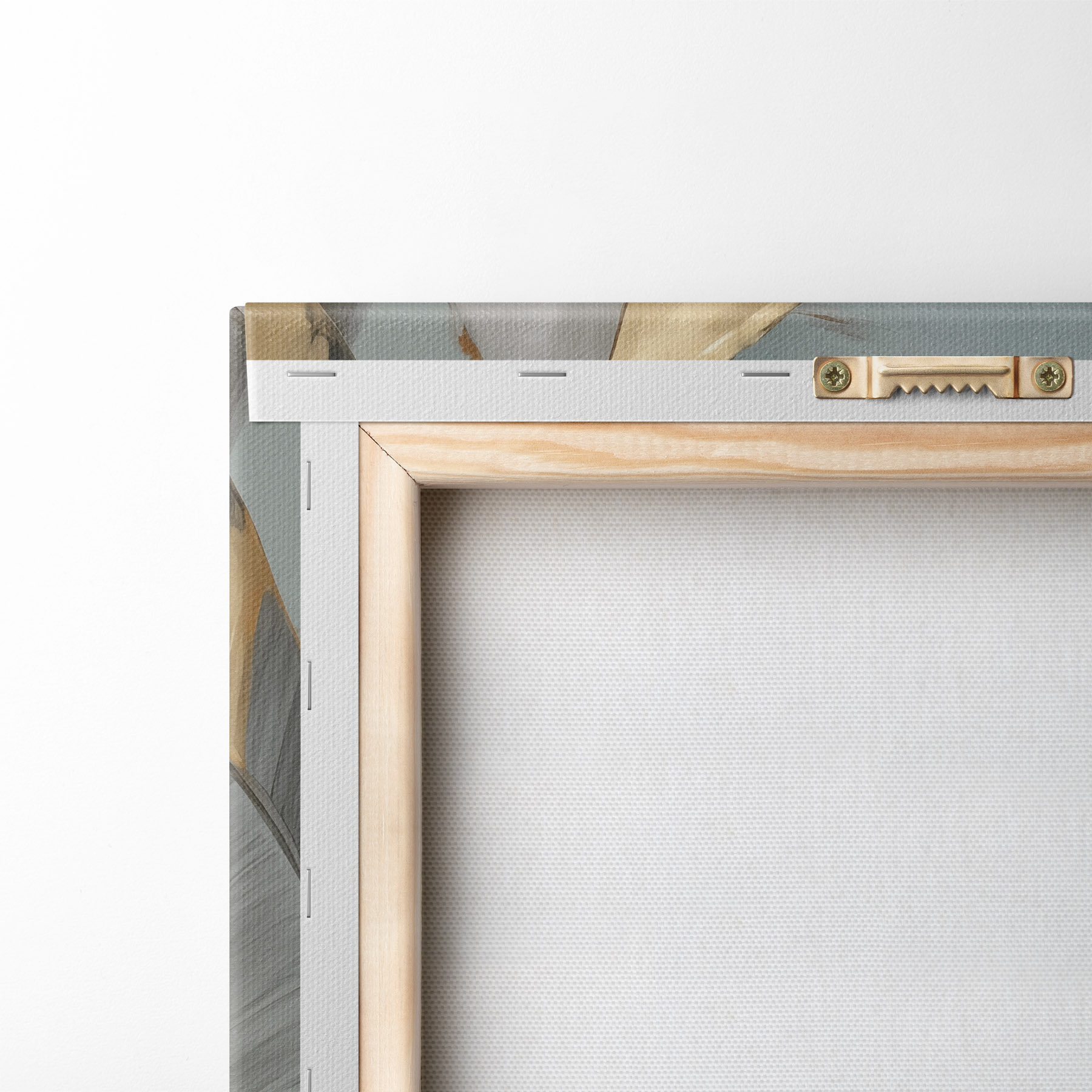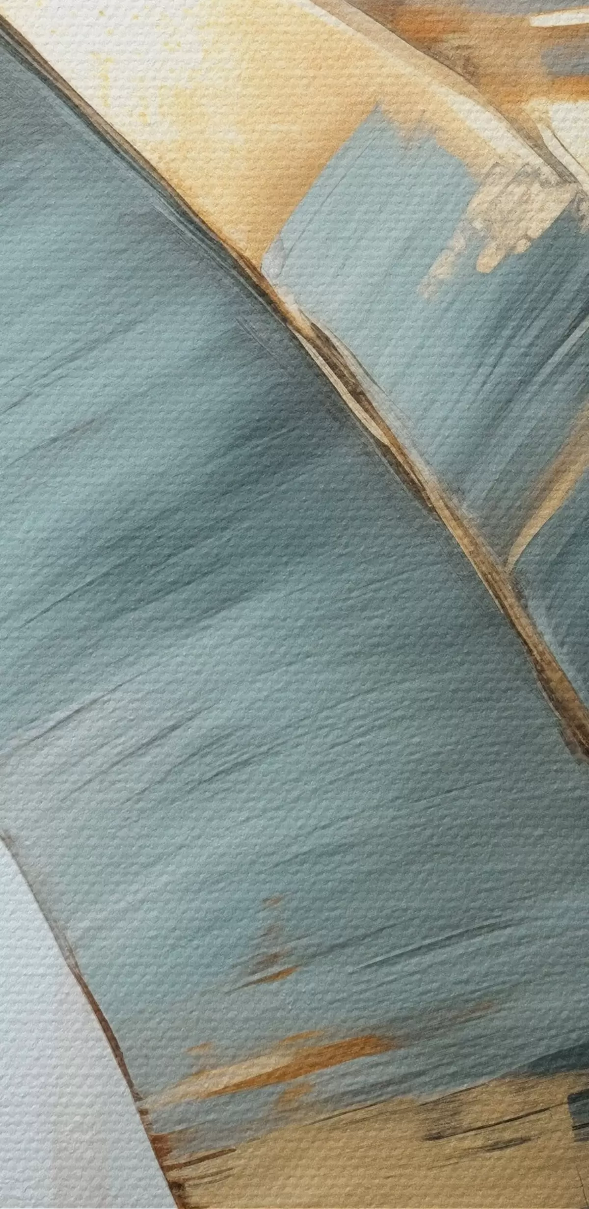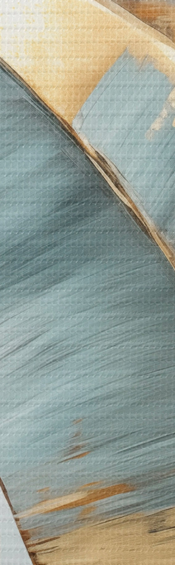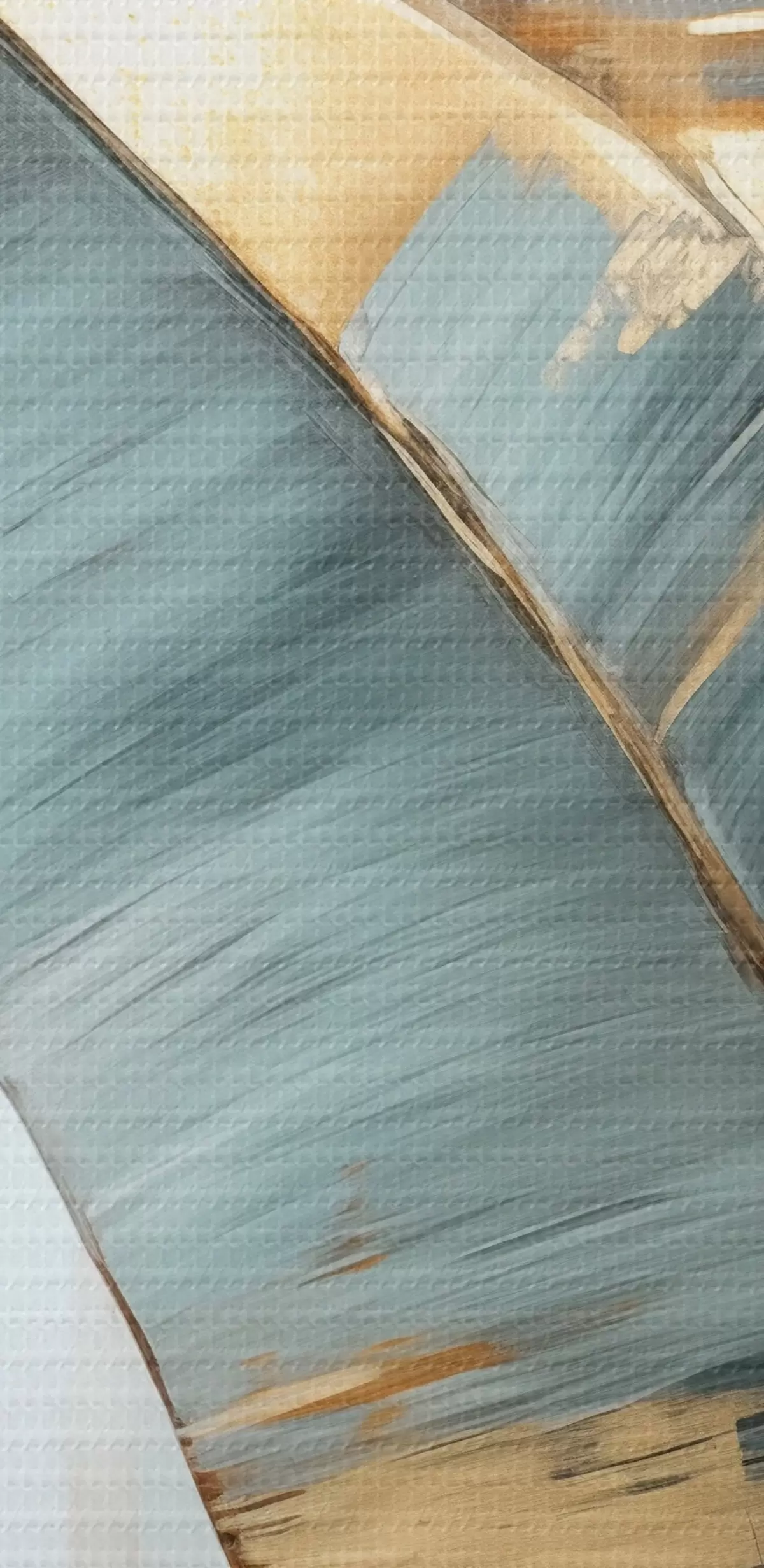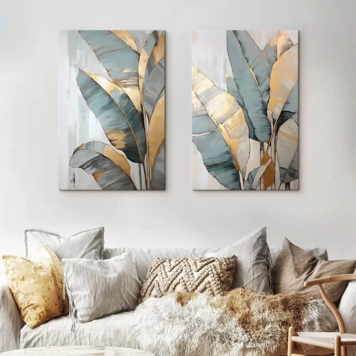 Paveikslas Prislopintų mėlynų, pilkų ir geltonų bananų lapų rinkinys su matomais teptuko potėpiais baltame abstrakčiame fone Nr m00645