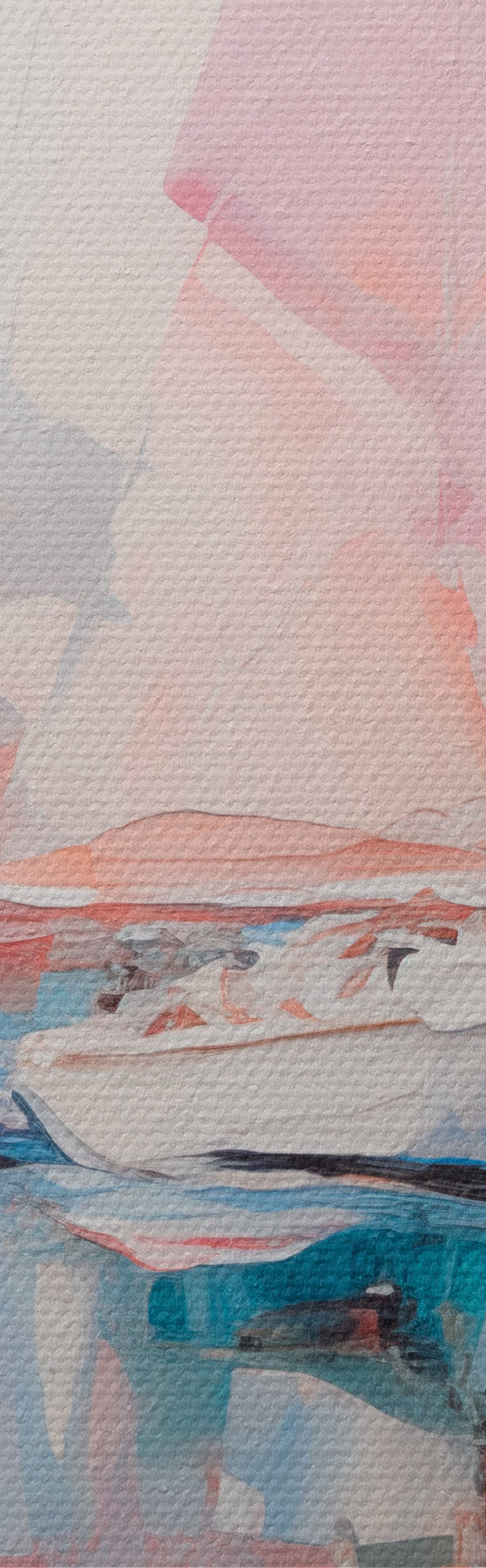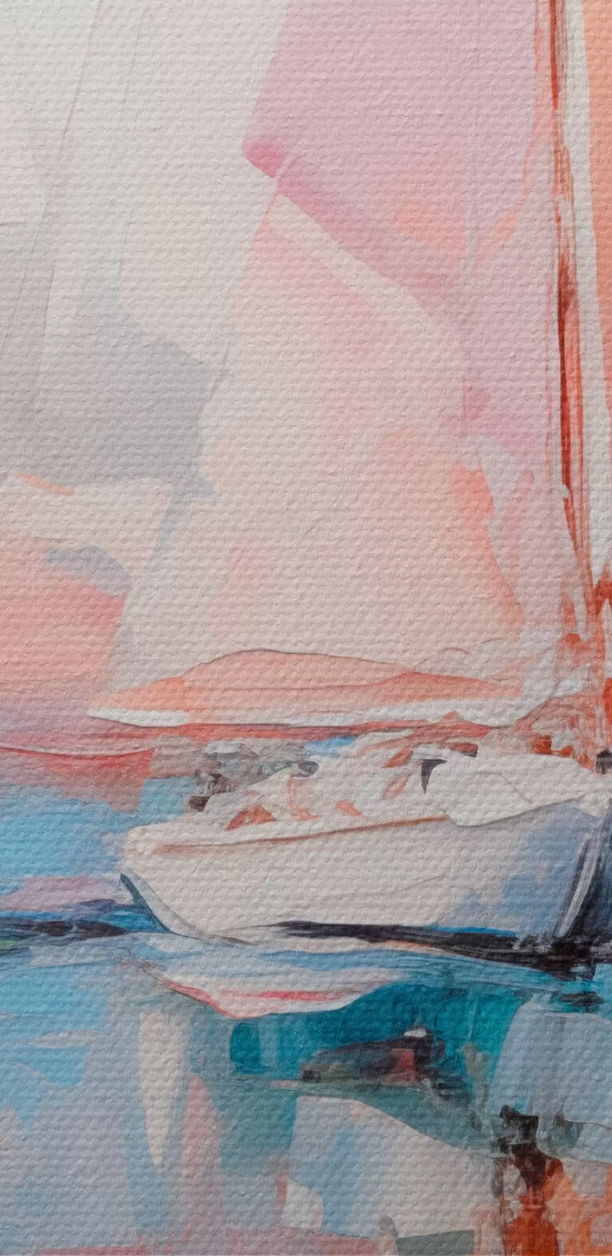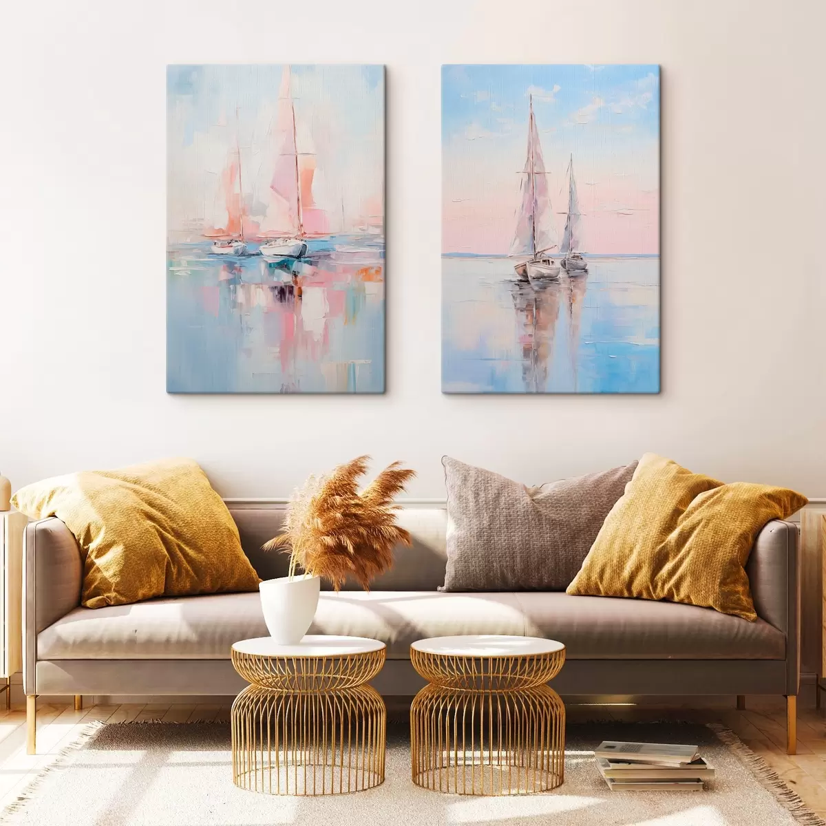 Paveikslas Ramioje jūroje plaukiojančios burinės valtys su rausvomis burėmis, valčių atspindžiai vandenyje, švelnios pastelinės spalvos Nr m00648