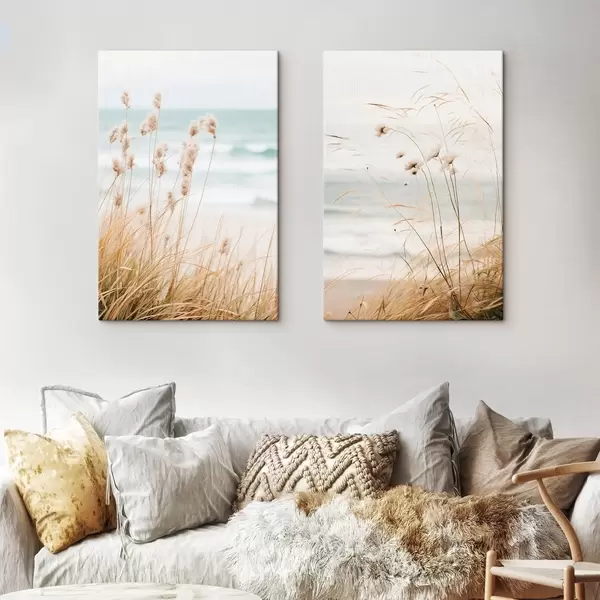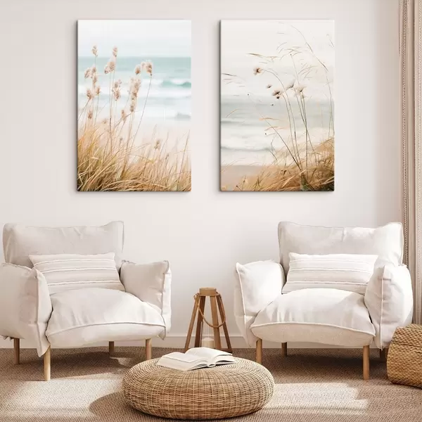 Paveikslas Aukšta žolė su pūkuotomis sėklų galvutėmis, smėlio paplūdimys ir vandenyno bangos fone, švelni ir prislopinta spalvų paletė Nr m00650