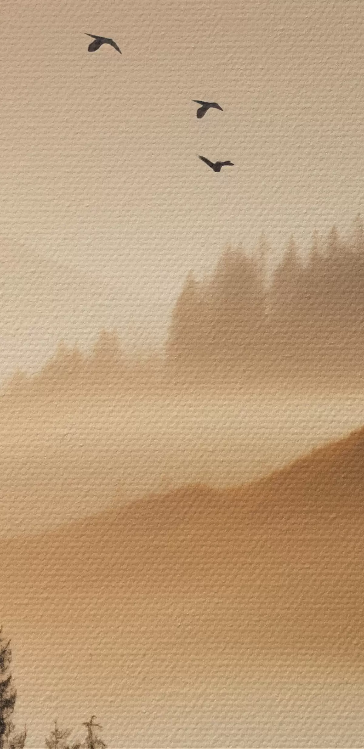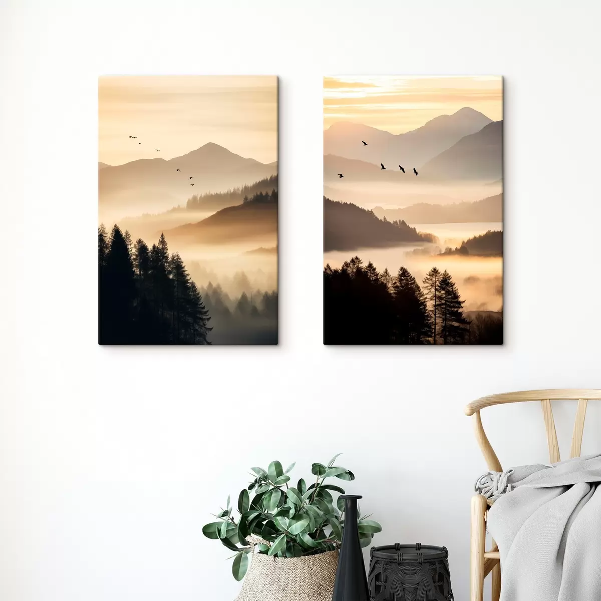 Paveikslas Kalnų kraštovaizdis su mišku ir danguje skrendančiais paukščiais, visa tai dengia storas rūko sluoksnis saulėtekio metu Nr m00651