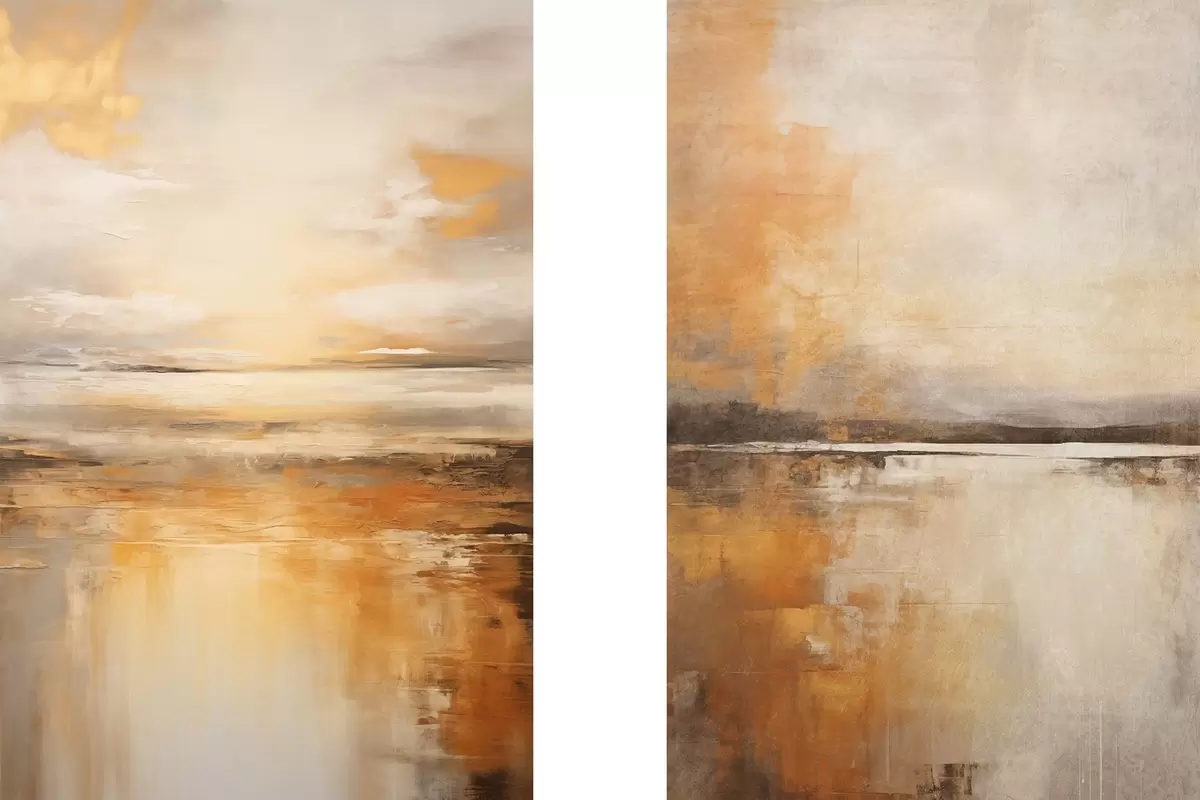 Paveikslas Abstraktus paplūdimio peizažas su ramiu vandenynu, oranžiniu smėliu ir debesuotu dangumi su saule Nr m00653