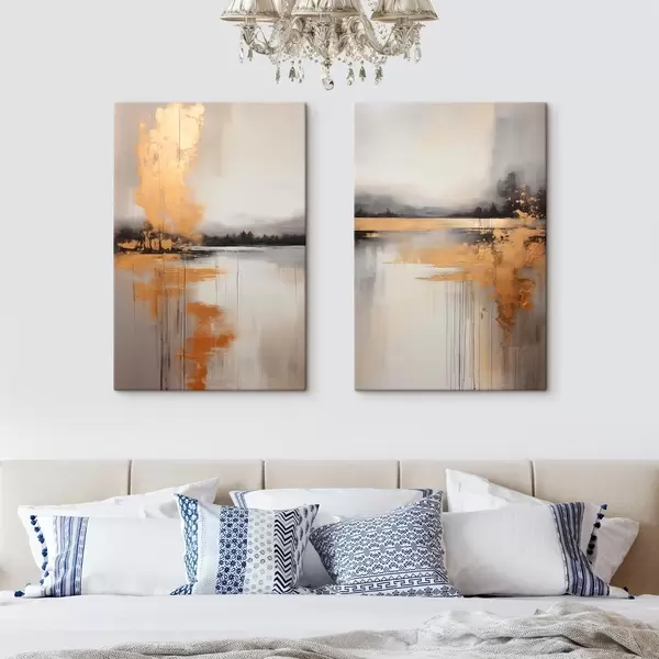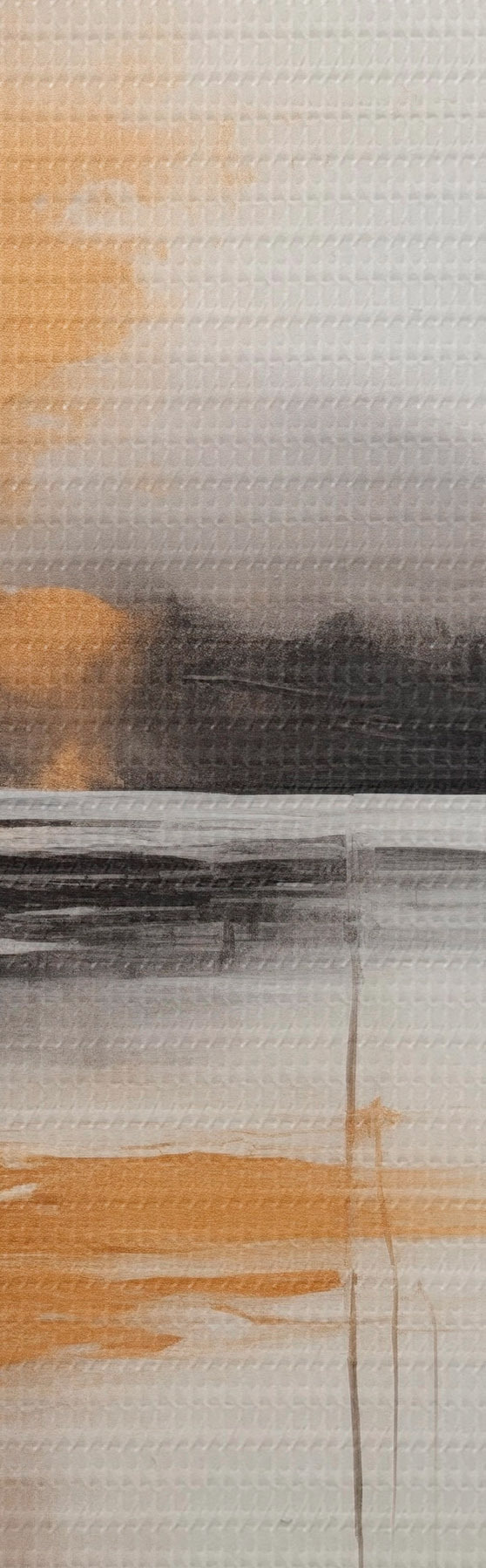 Paveikslas Abstraktus kraštovaizdis su ežeru, medžiu ir geltonu rūku , vanduo atspindi debesuotą dangų Nr m00657